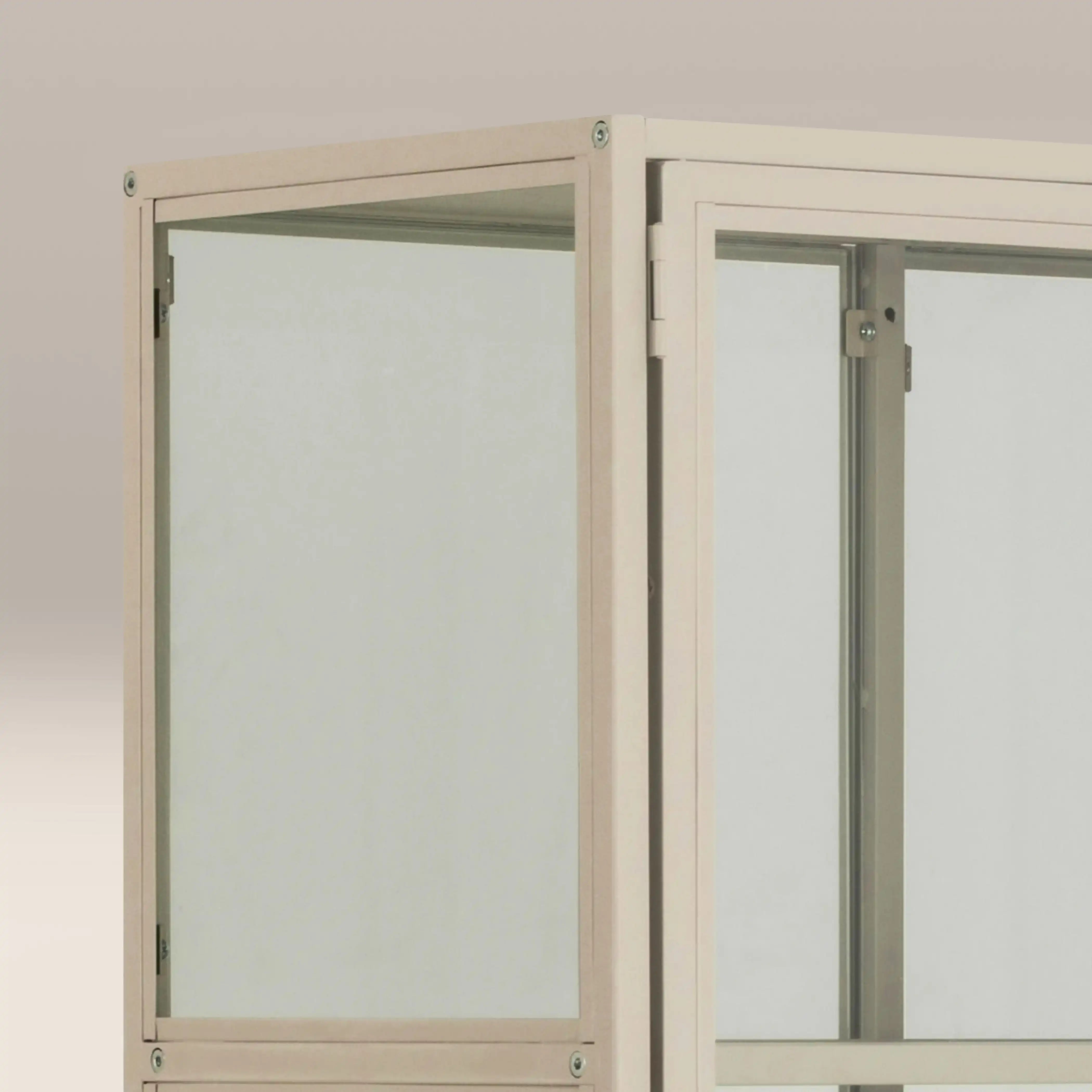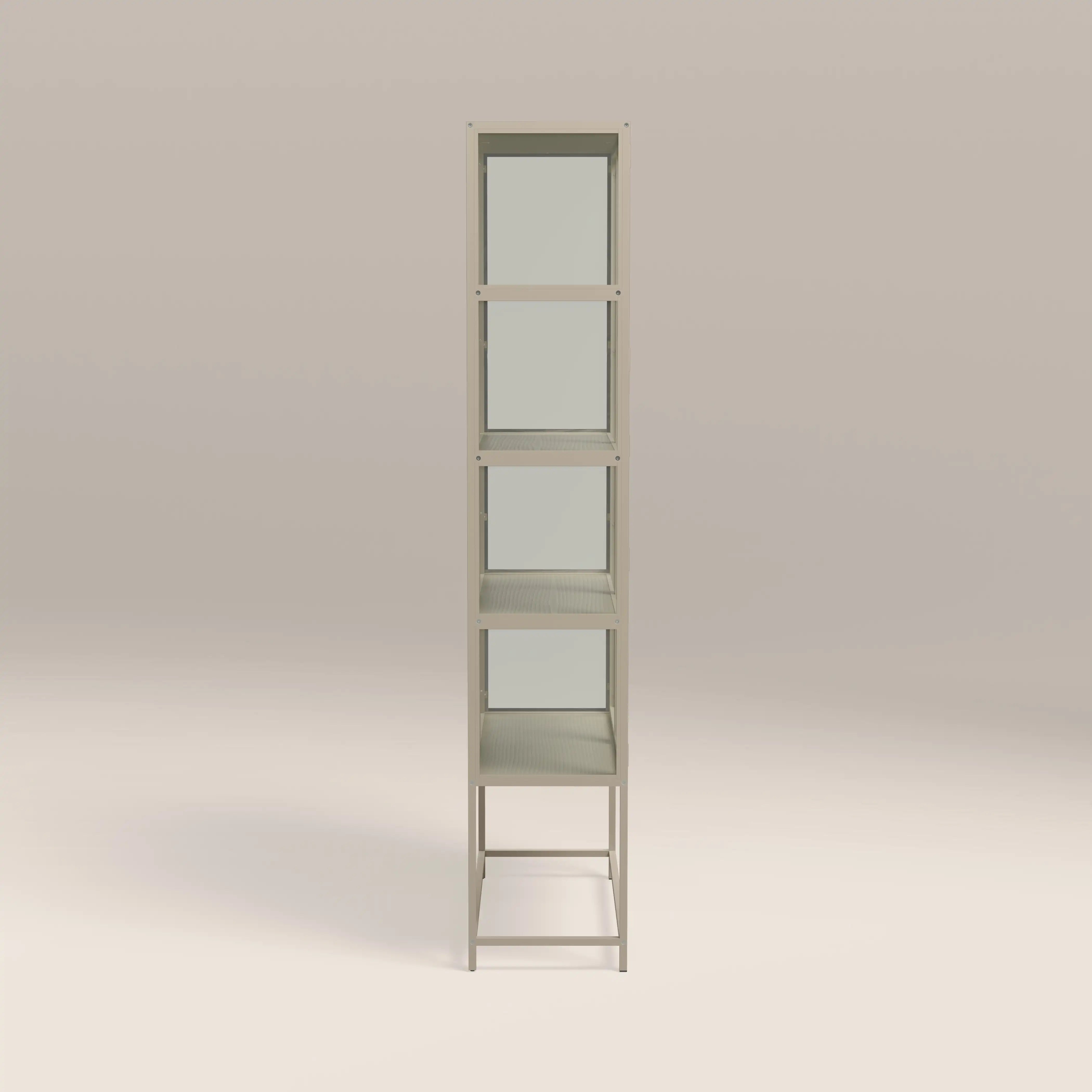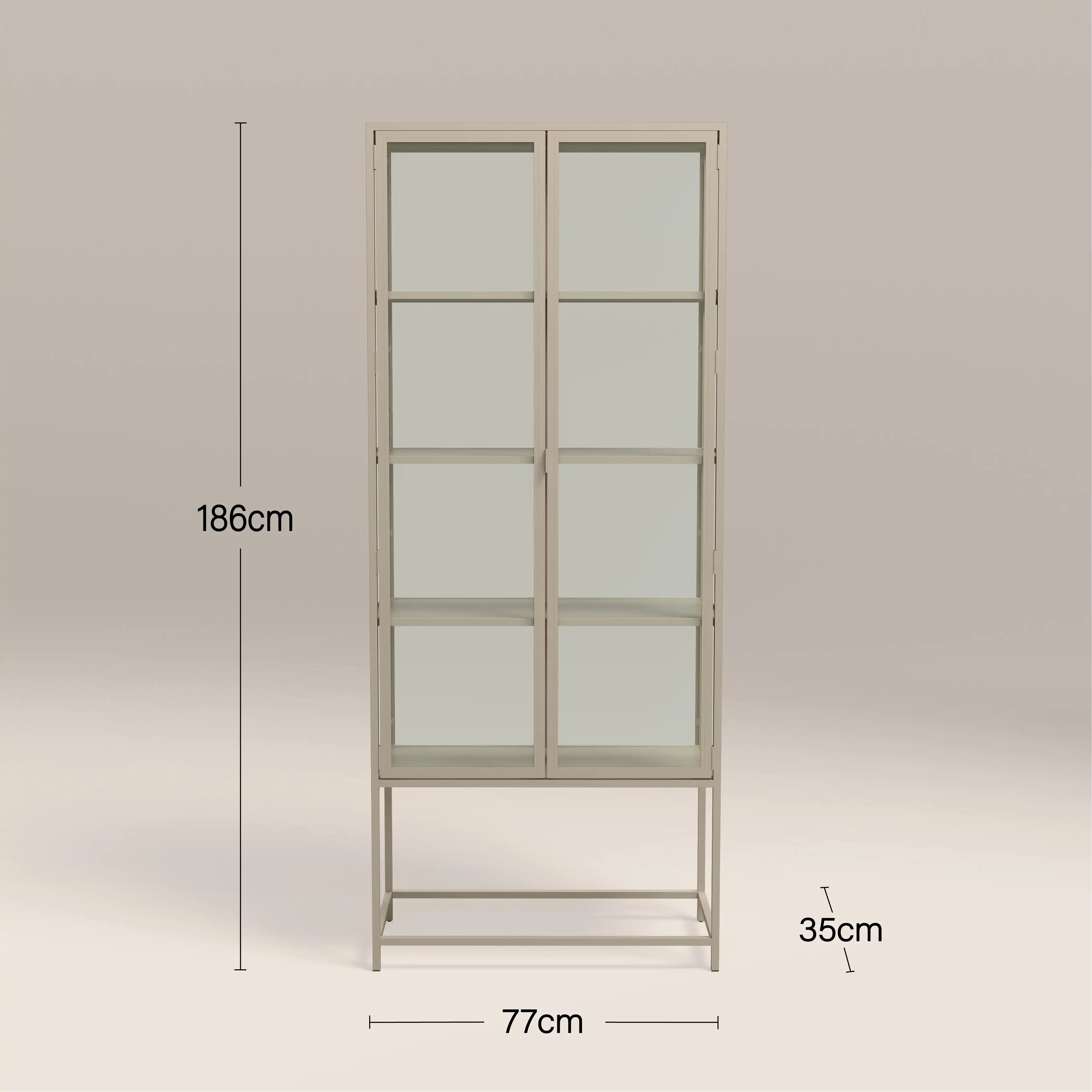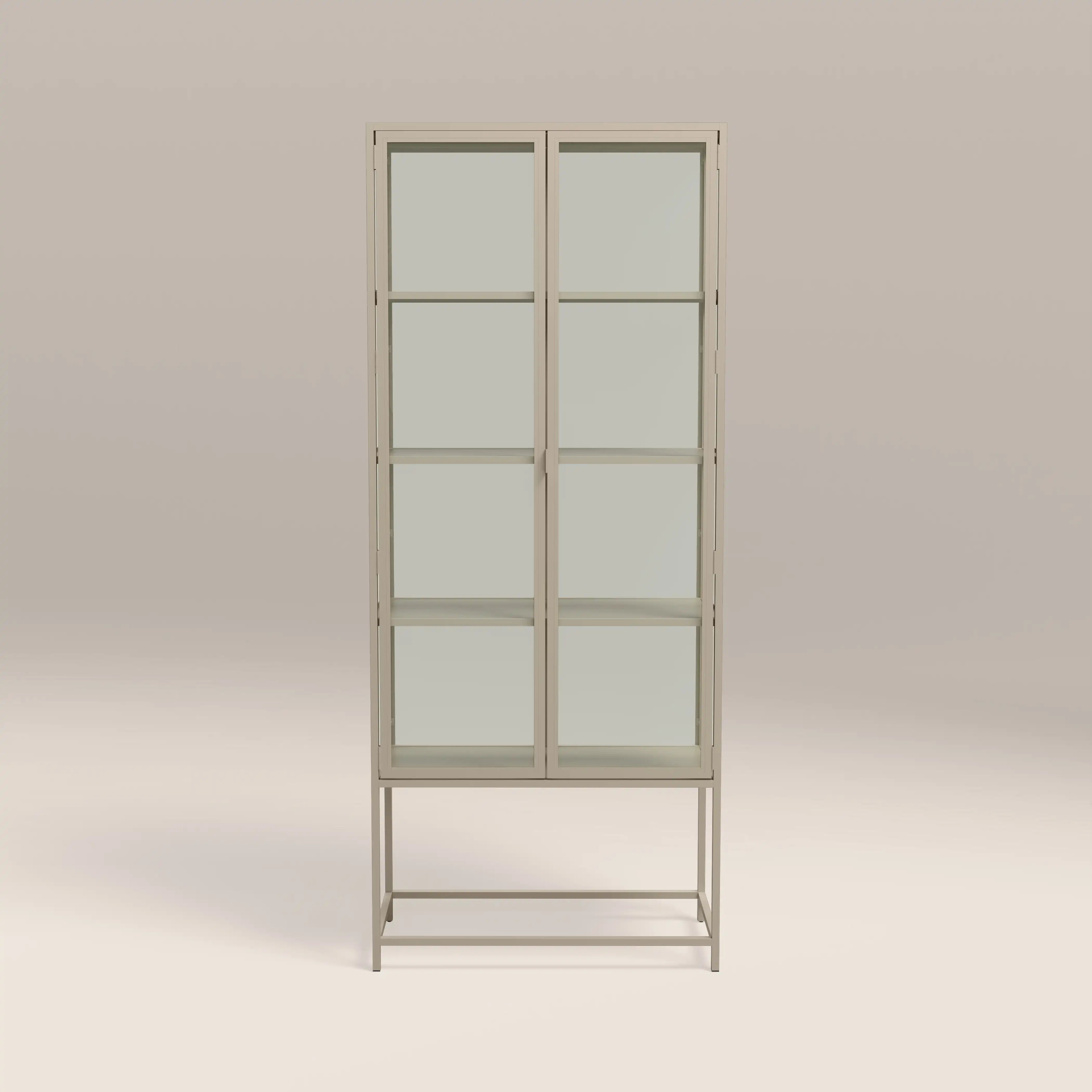 This Seaford Display Cabinet is designed to last. Its sleek metal frame has a taupe powder-coated finish with four shelves to provide ample space for storing essentials. This cabinet is the perfect addition to your dining room or living area with two glass doors. This sleek design is the epitome of minimalist industrial design.