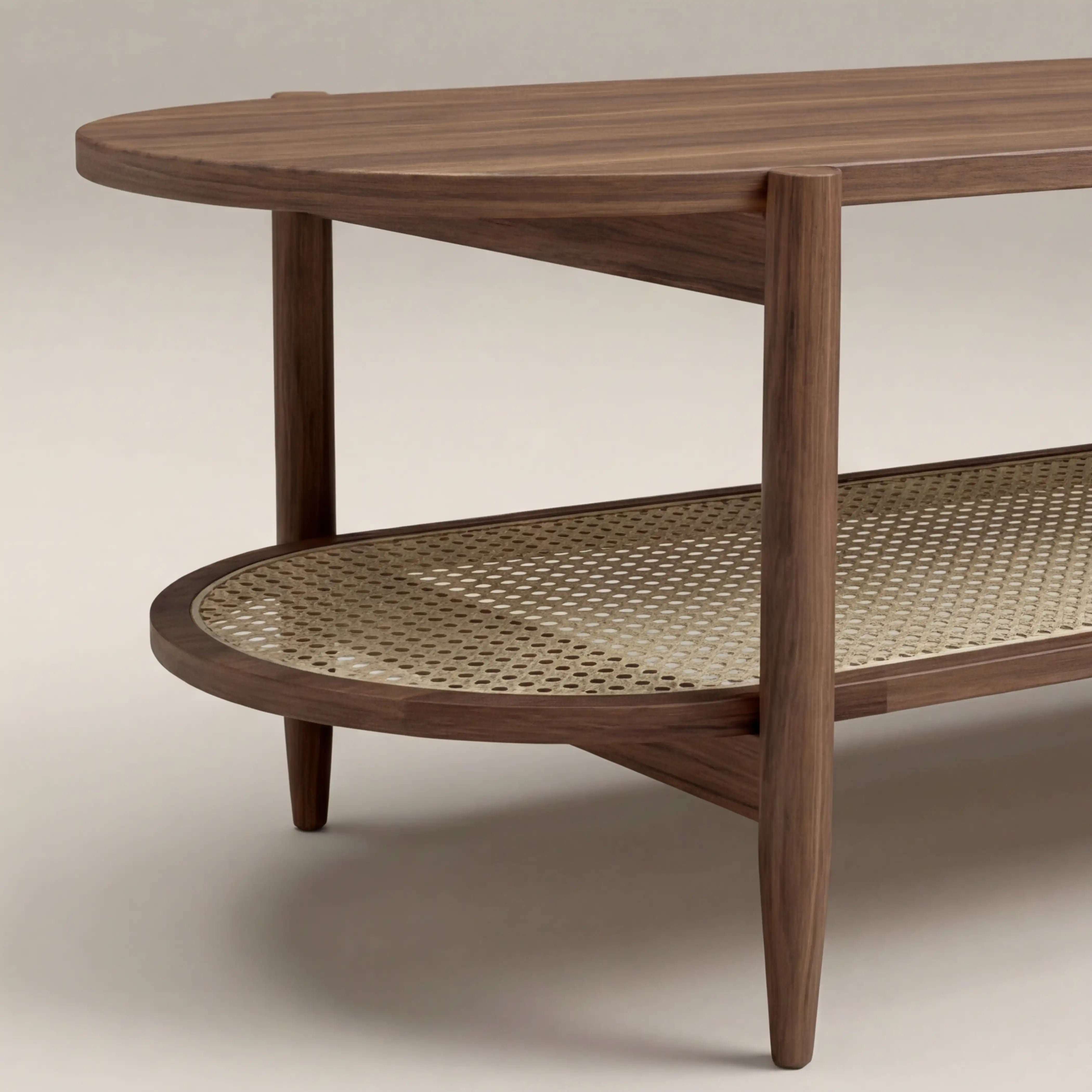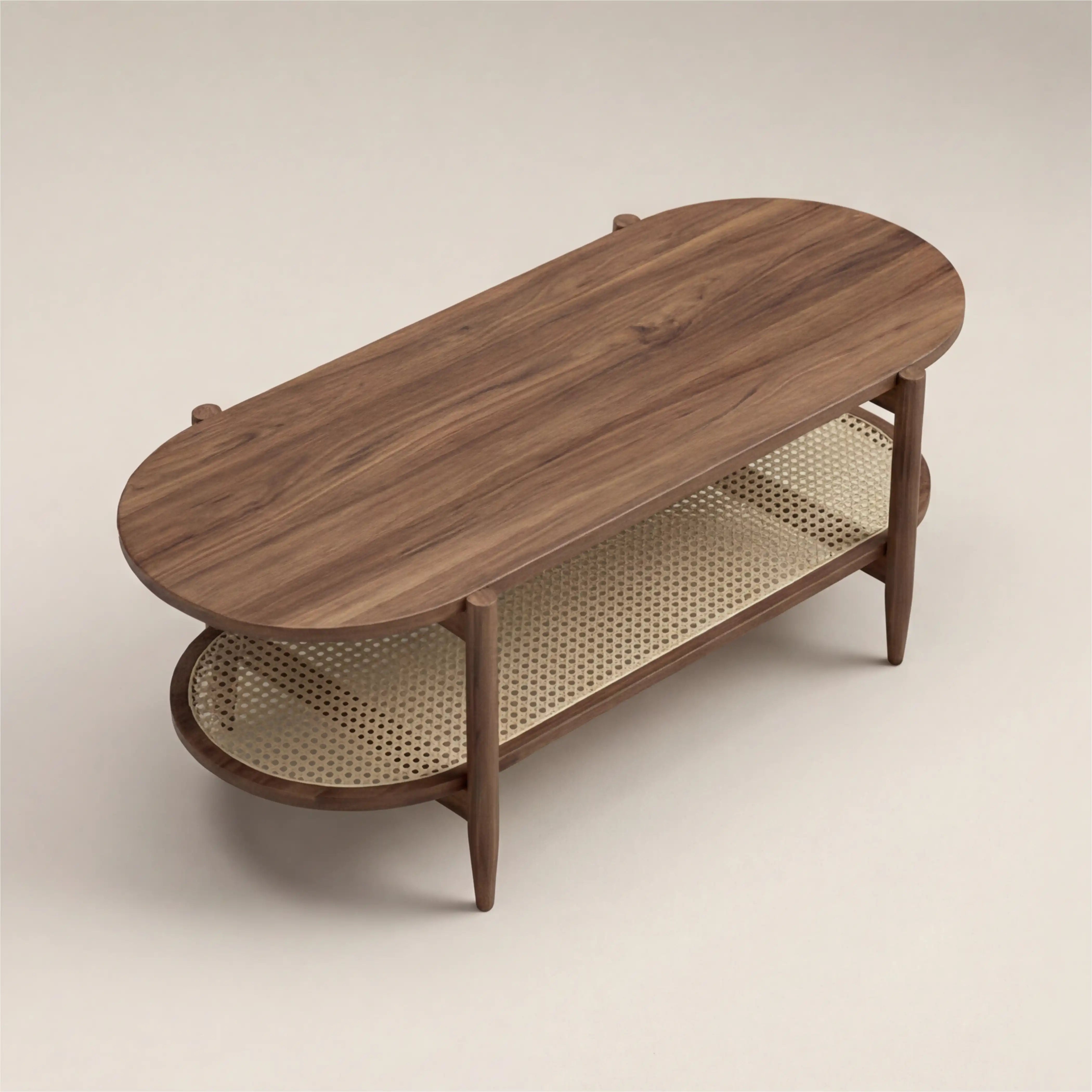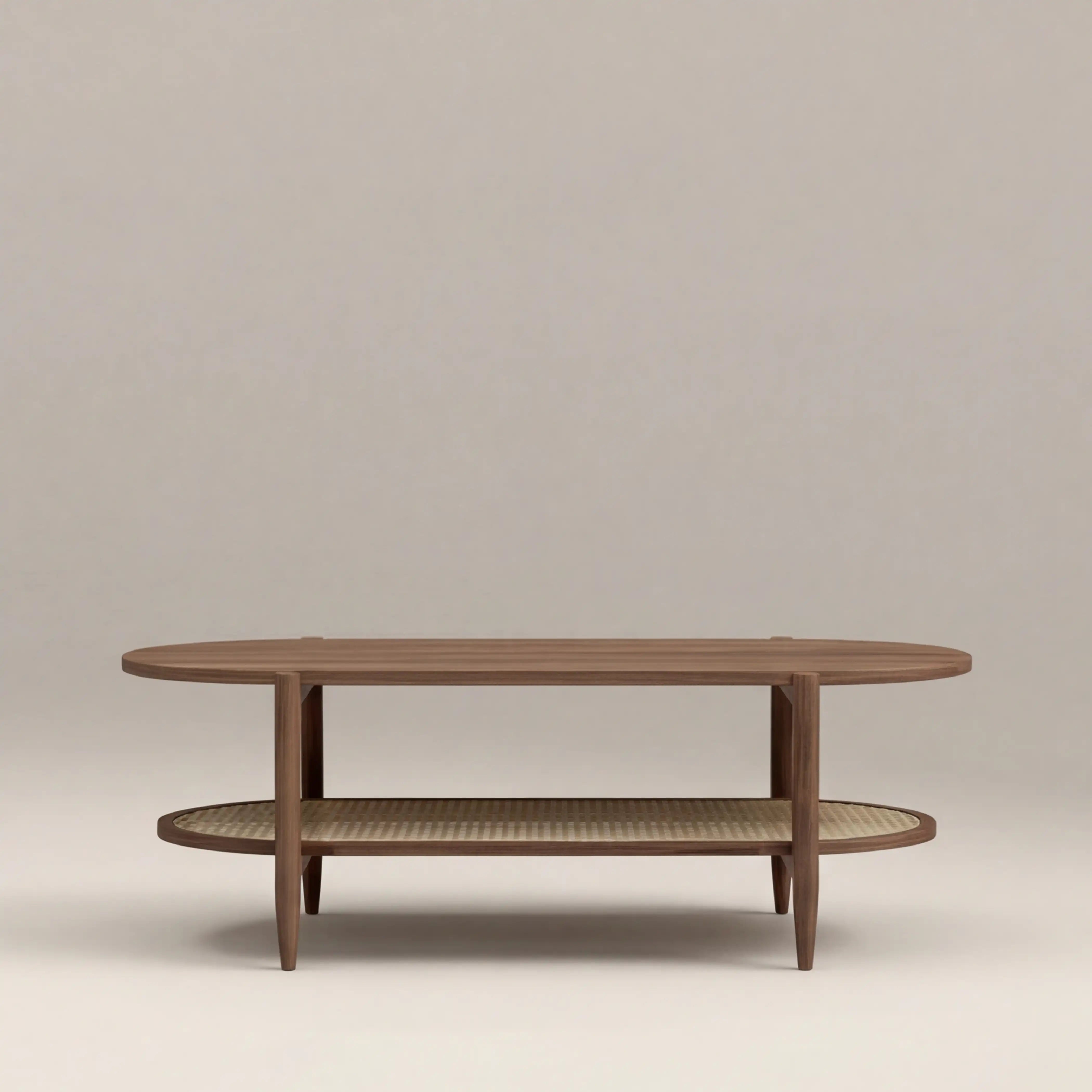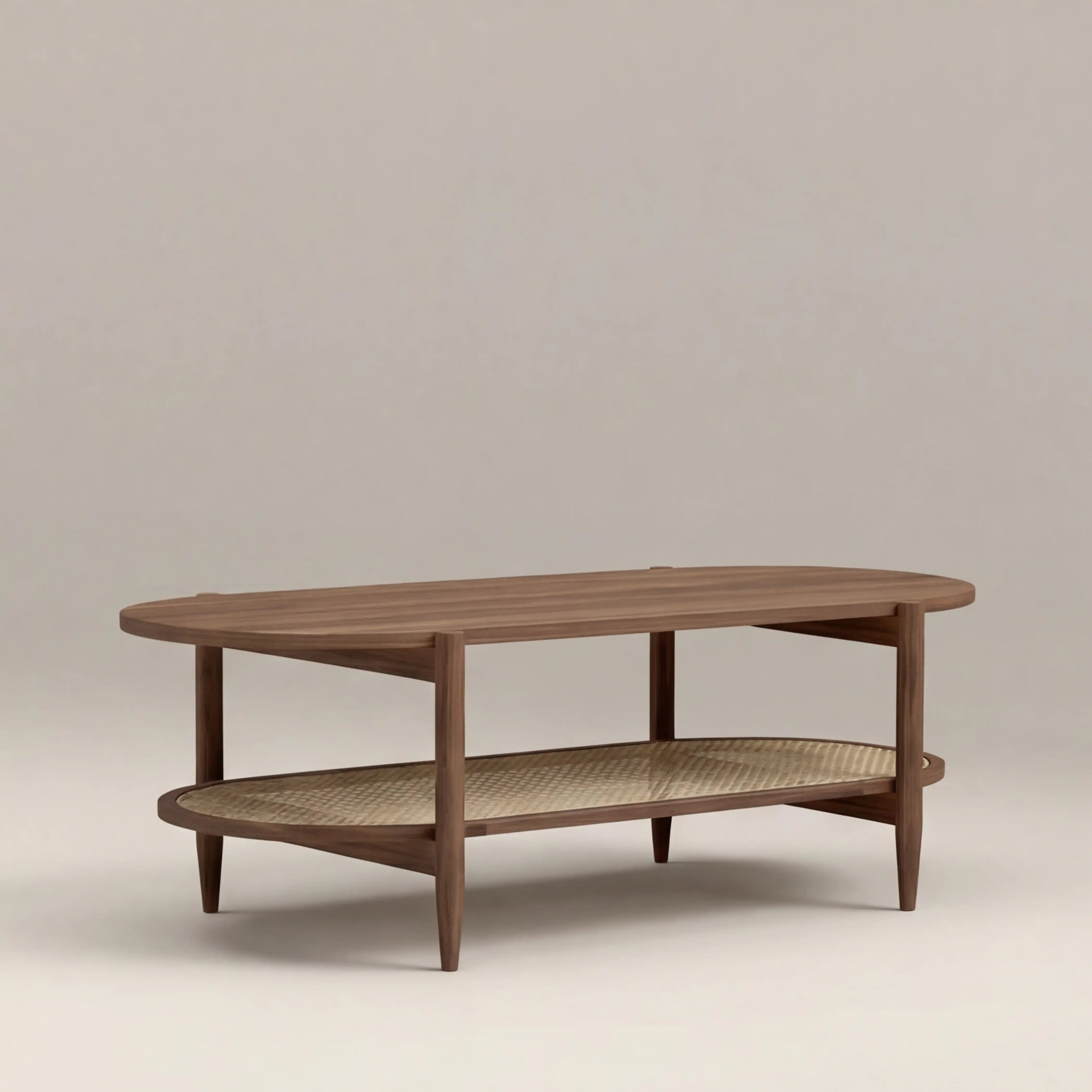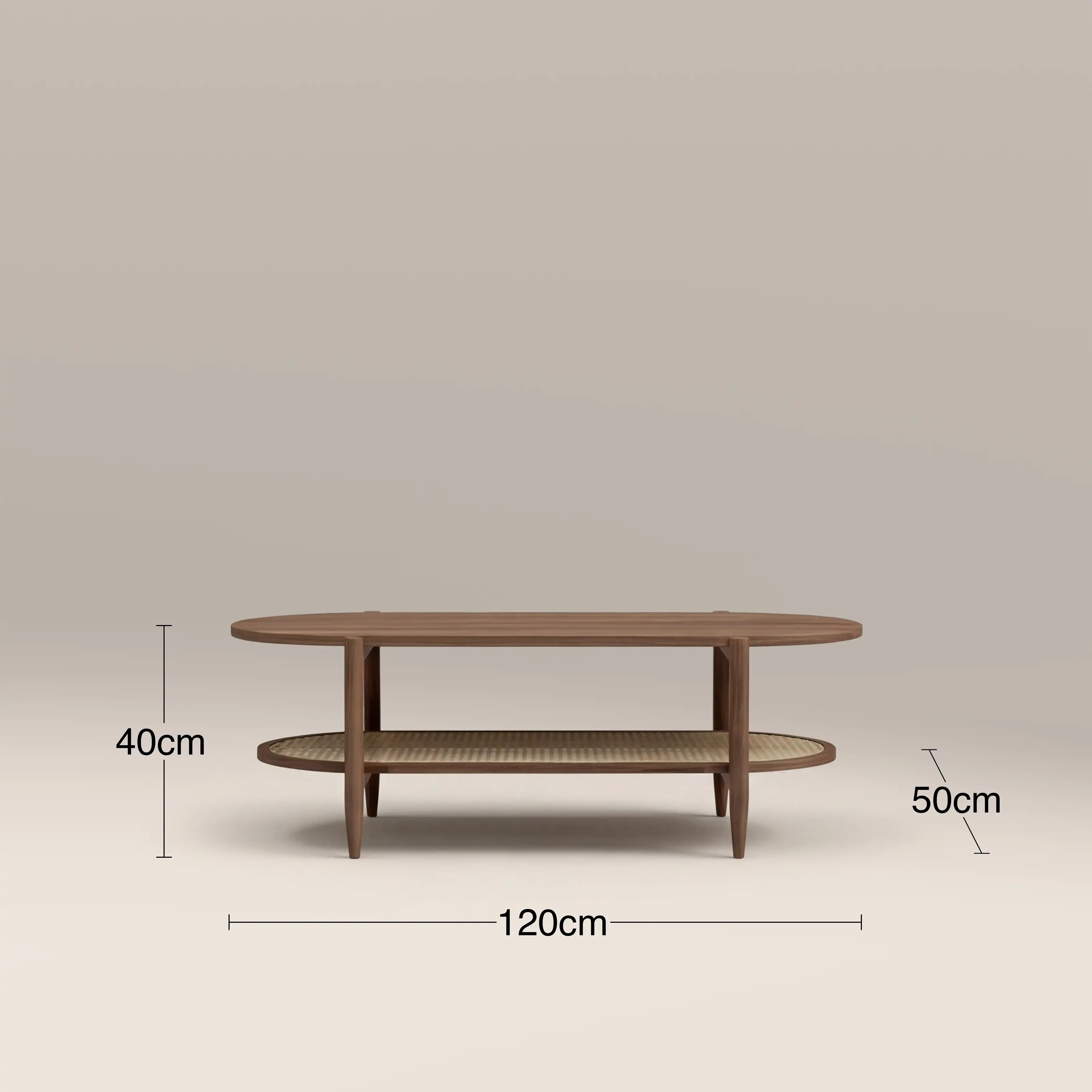 The Soller Wooden Coffee Table is Scandinavian style for your modern home with its soft curves and natural hues. In a walnut-stained finish with natural cane lower shelf, this minimalist silhouette mixes Nordic style with Japandi influences for a purposeful design made from durable high quality materials. Made from durable and stain-resistant melamine, the Soller Collection is perfect for everyday use with this easy-to-maintain material.