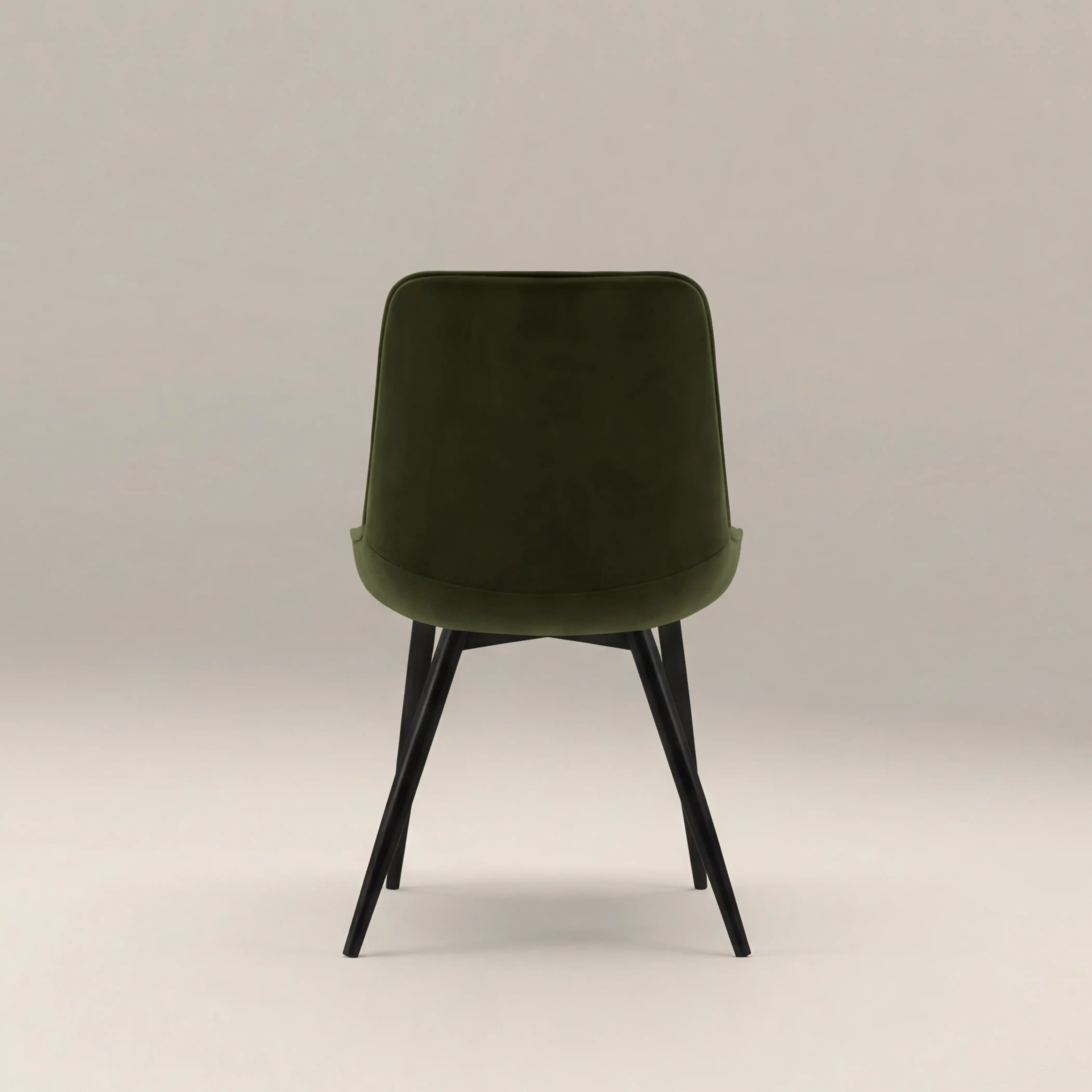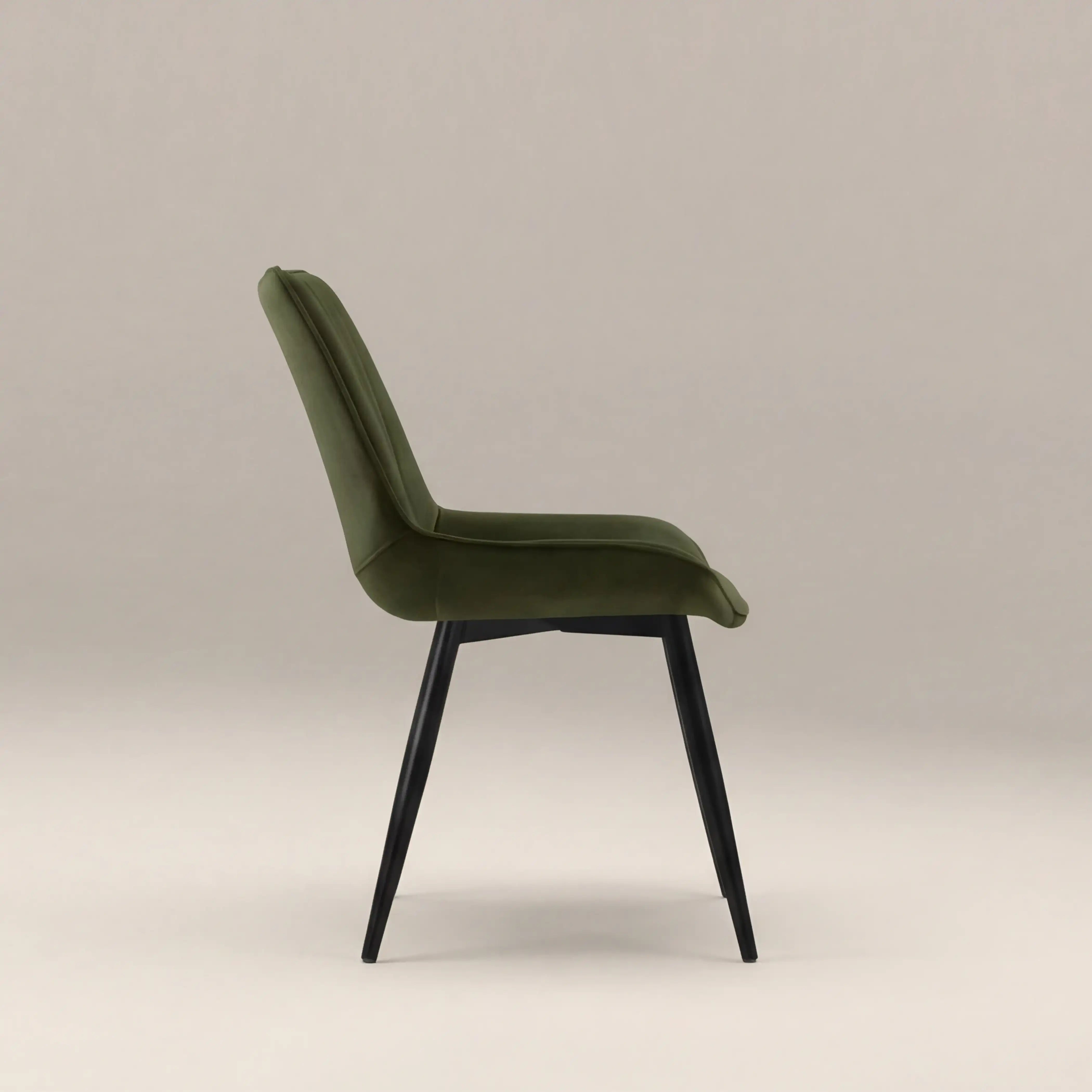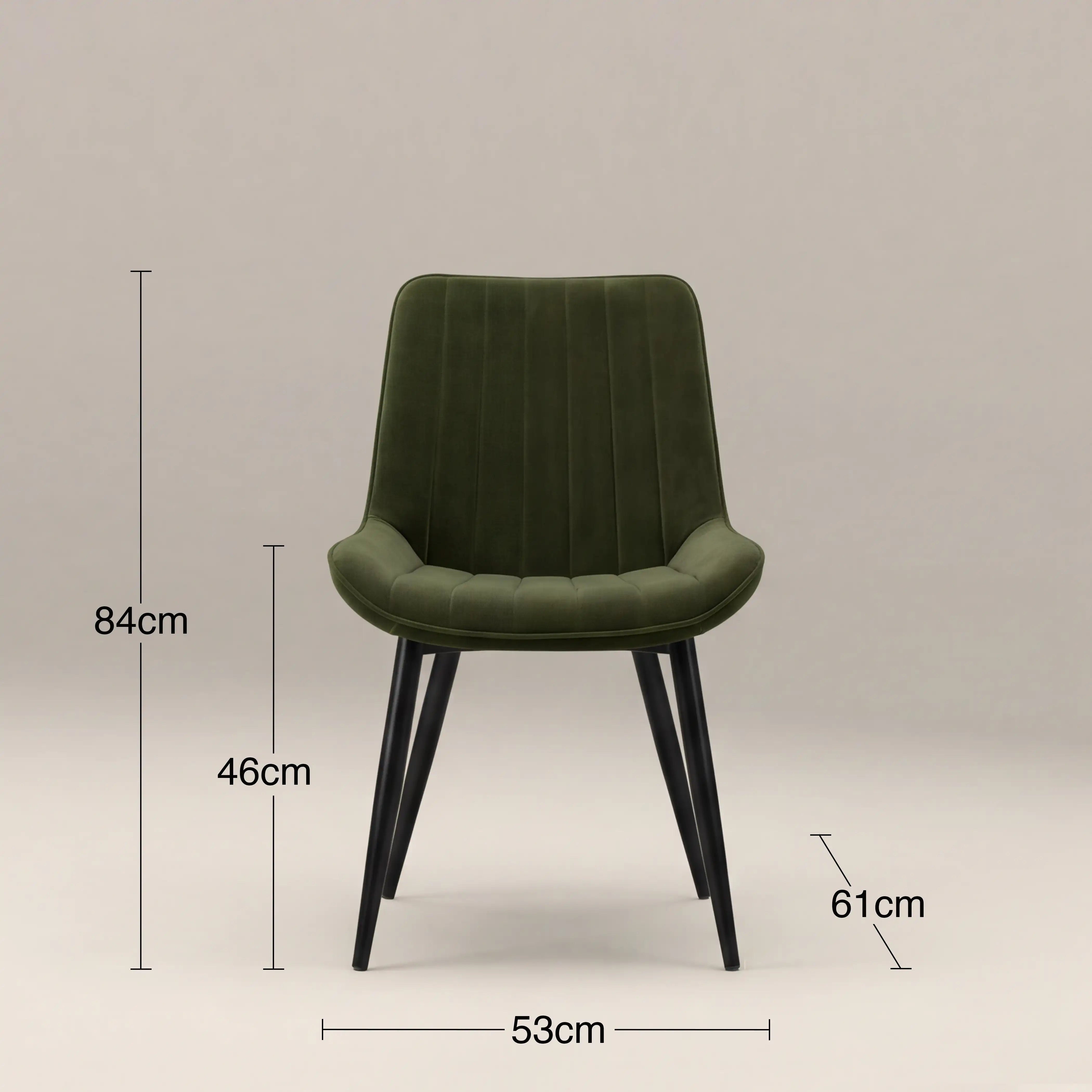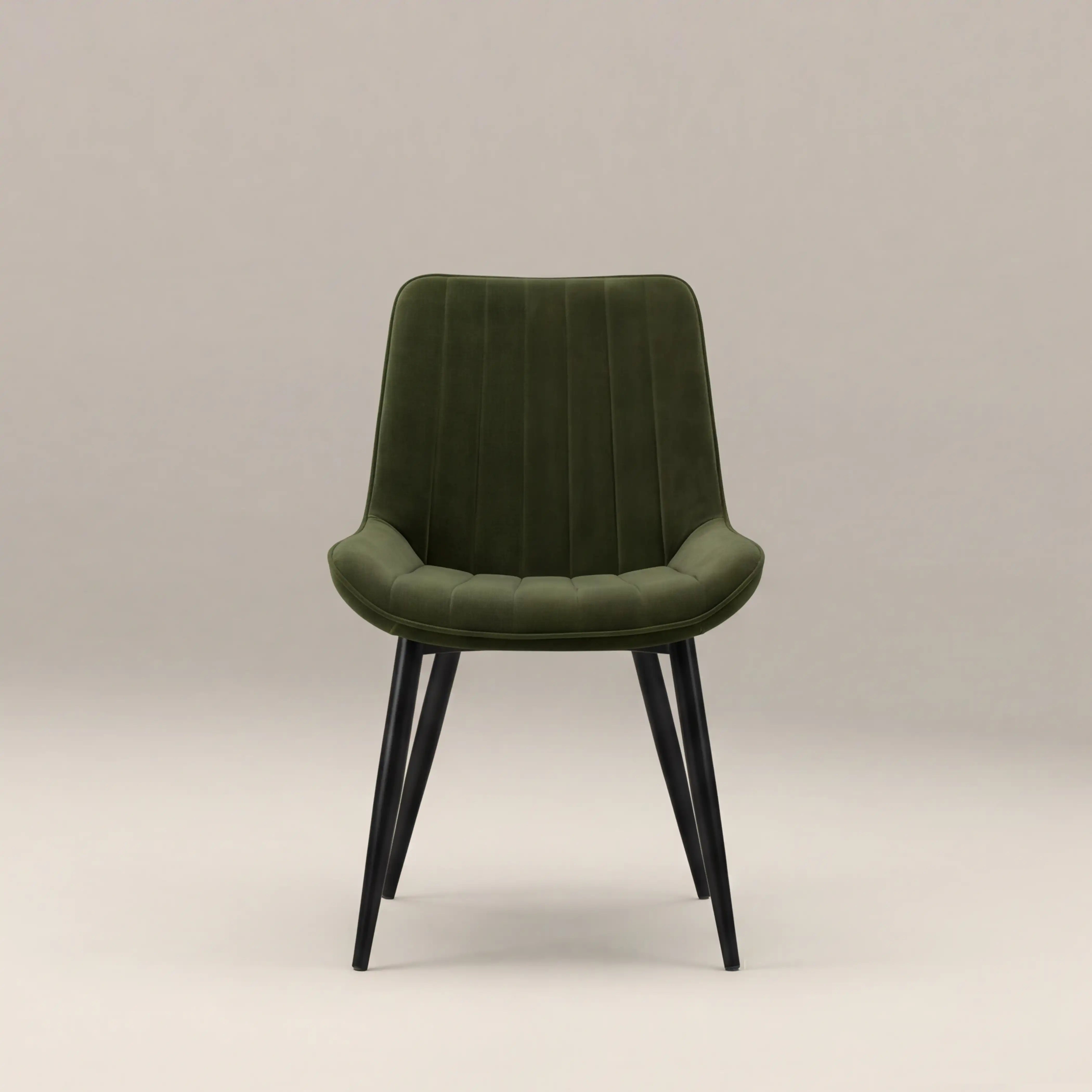 Classic, stylish, and practical, the Taylor Velvet Dining Chair is upholstered in rich olive green sustainable velvet with vertical stitching on the backrest. With a curved seat and backrest, and black metal legs angled for stability, this modern dining chair elevates dinner time.
