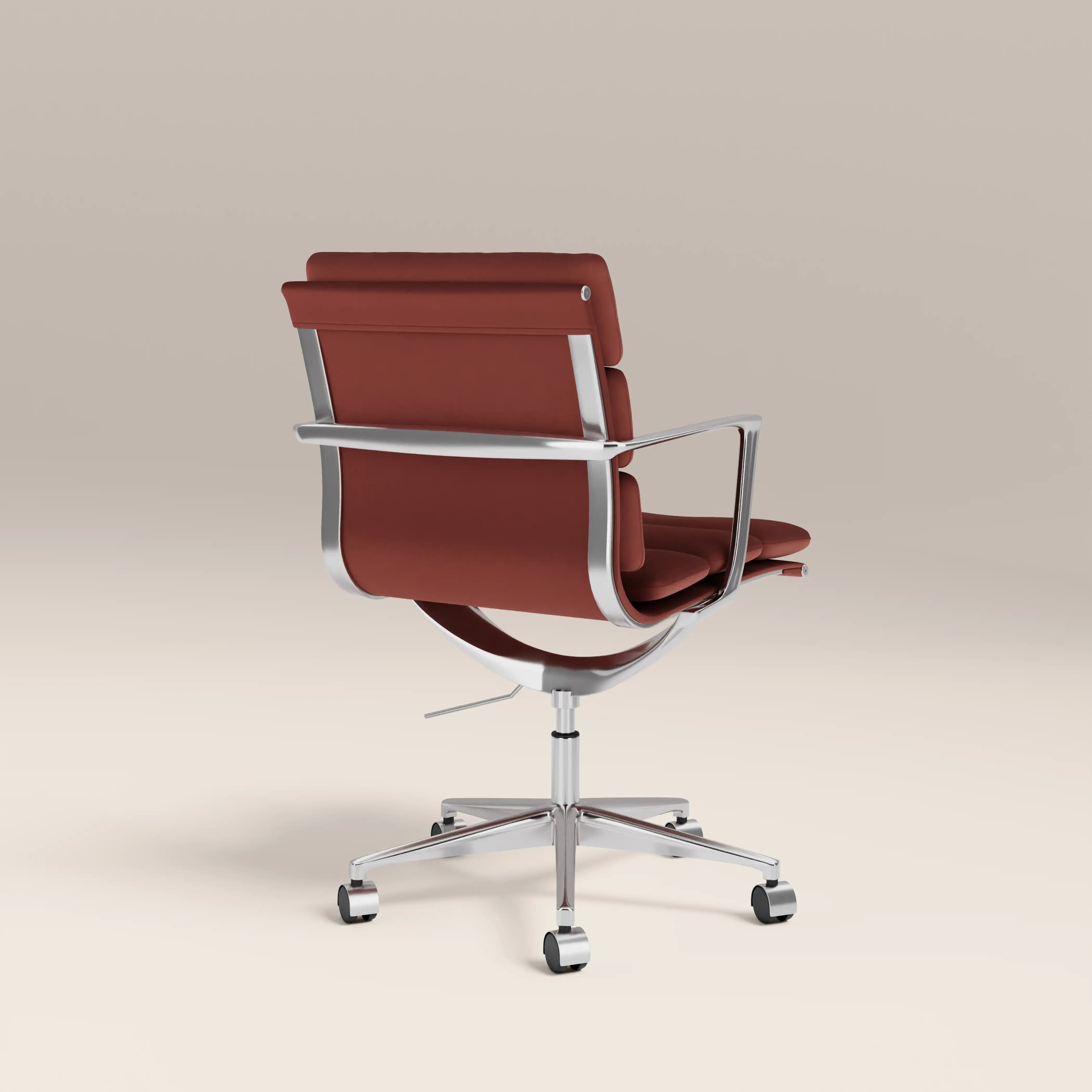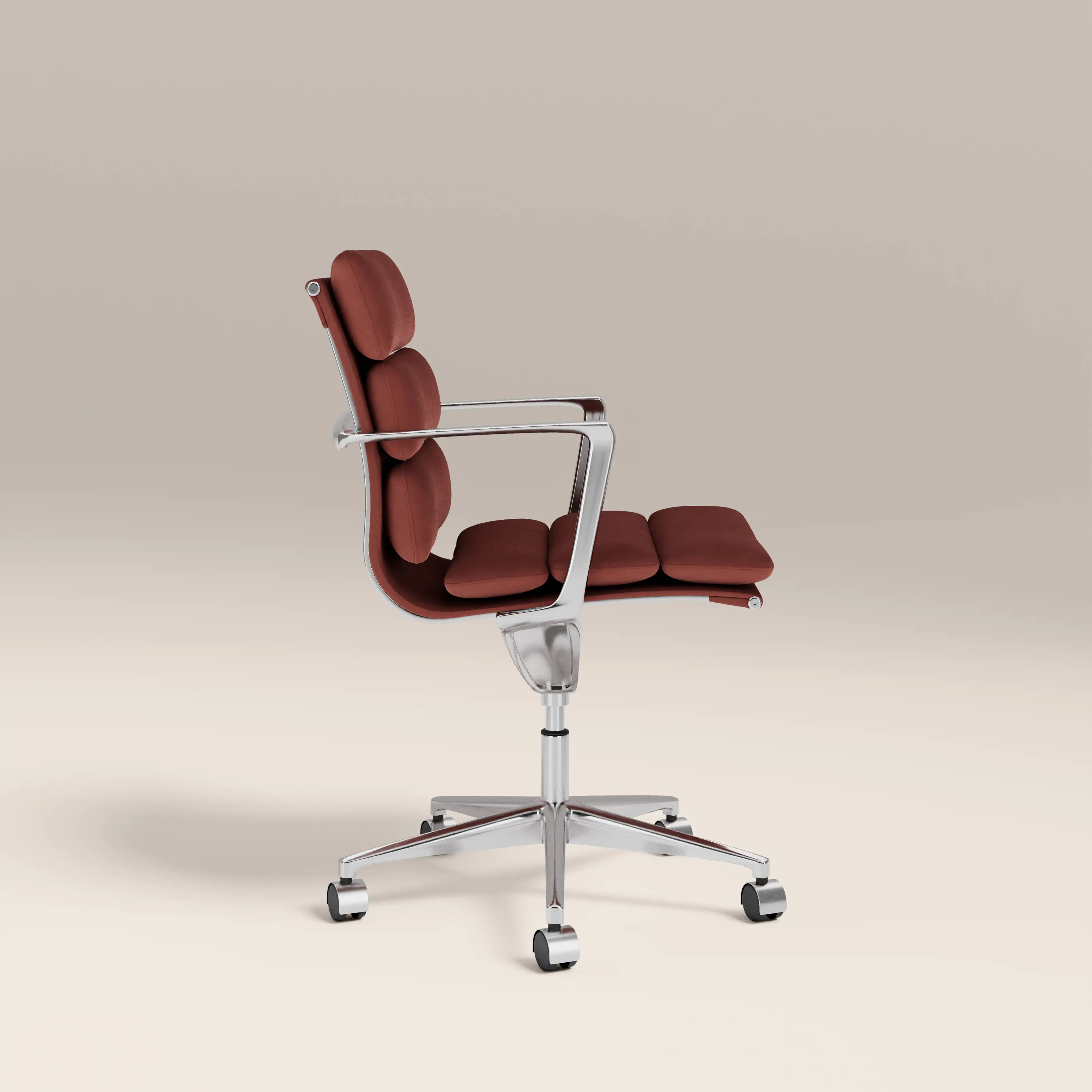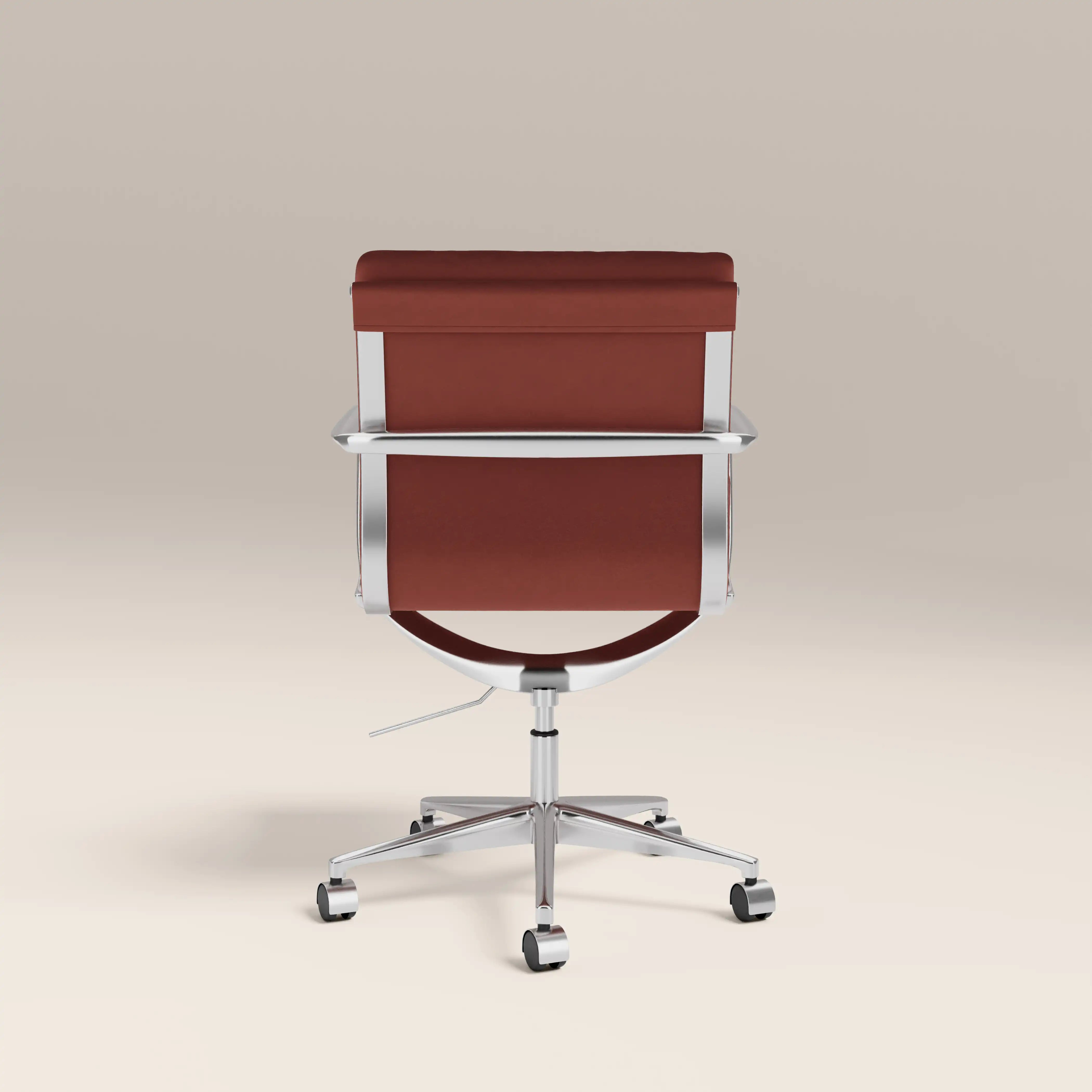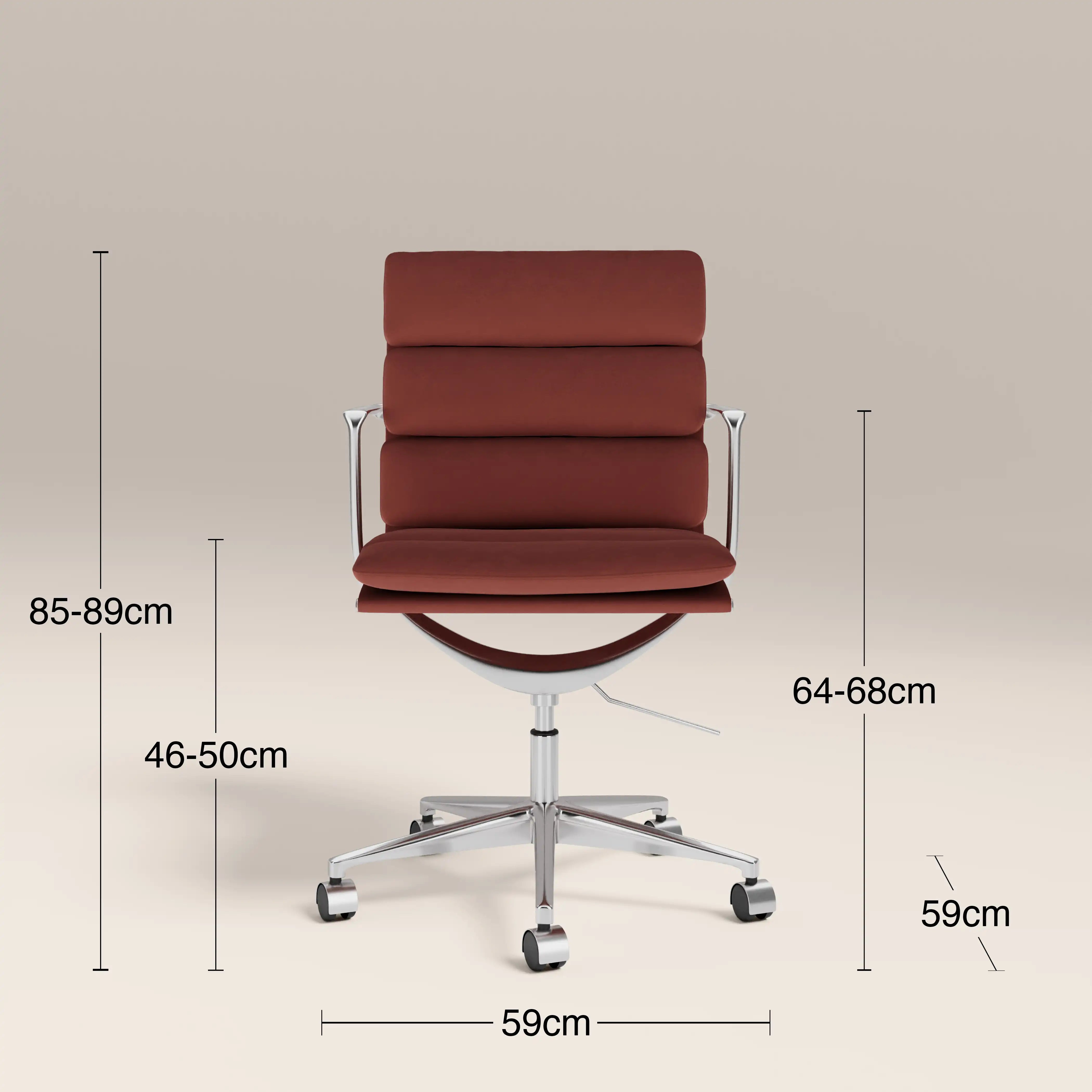 Soft padding, height adjustable, and swivel function make the Urma Low Back Office Chair a stylish yet functional solution for your work-from-home setup. With a sleek chrome metal frame upon five wheels and soft rust red velvet upholstery with padded seat and backrest, the Urma Range is a modern, sleek design.