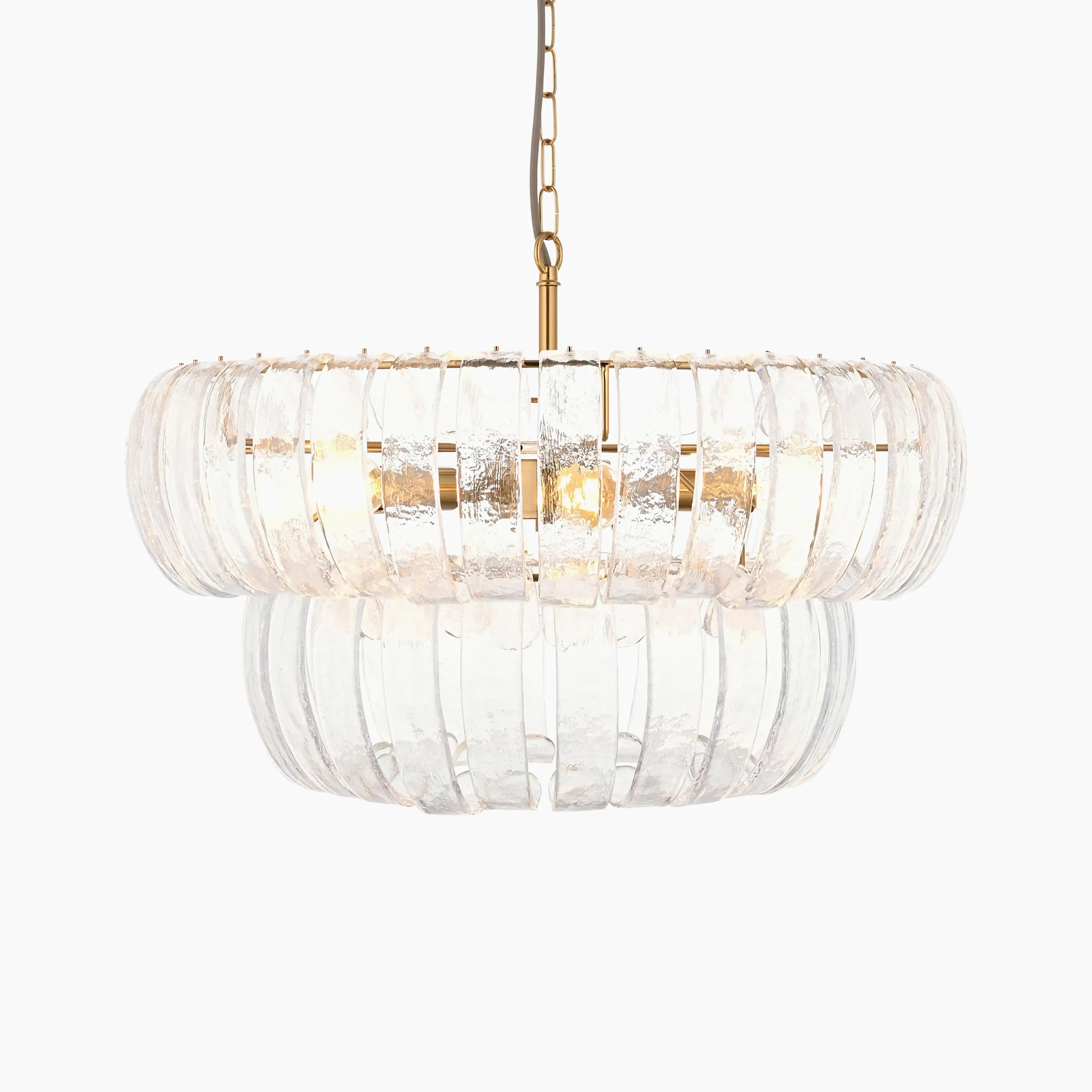 A centrepiece you fall for every time. The Vera Pendant features handcrafted curved glass panels that cascade in a hypnotic, two-tiered arrangement, catching the light like liquid crystal. Suspended from a 1.5m height-adjustable chain with grey braided flex, the warm, brushed aged brass frame adds timeless sophistication. Dimmable and designed for E14 LED filament lamps, it transforms dining rooms, entryways, or high-ceilinged spaces into sculptural, glowing sanctuaries.