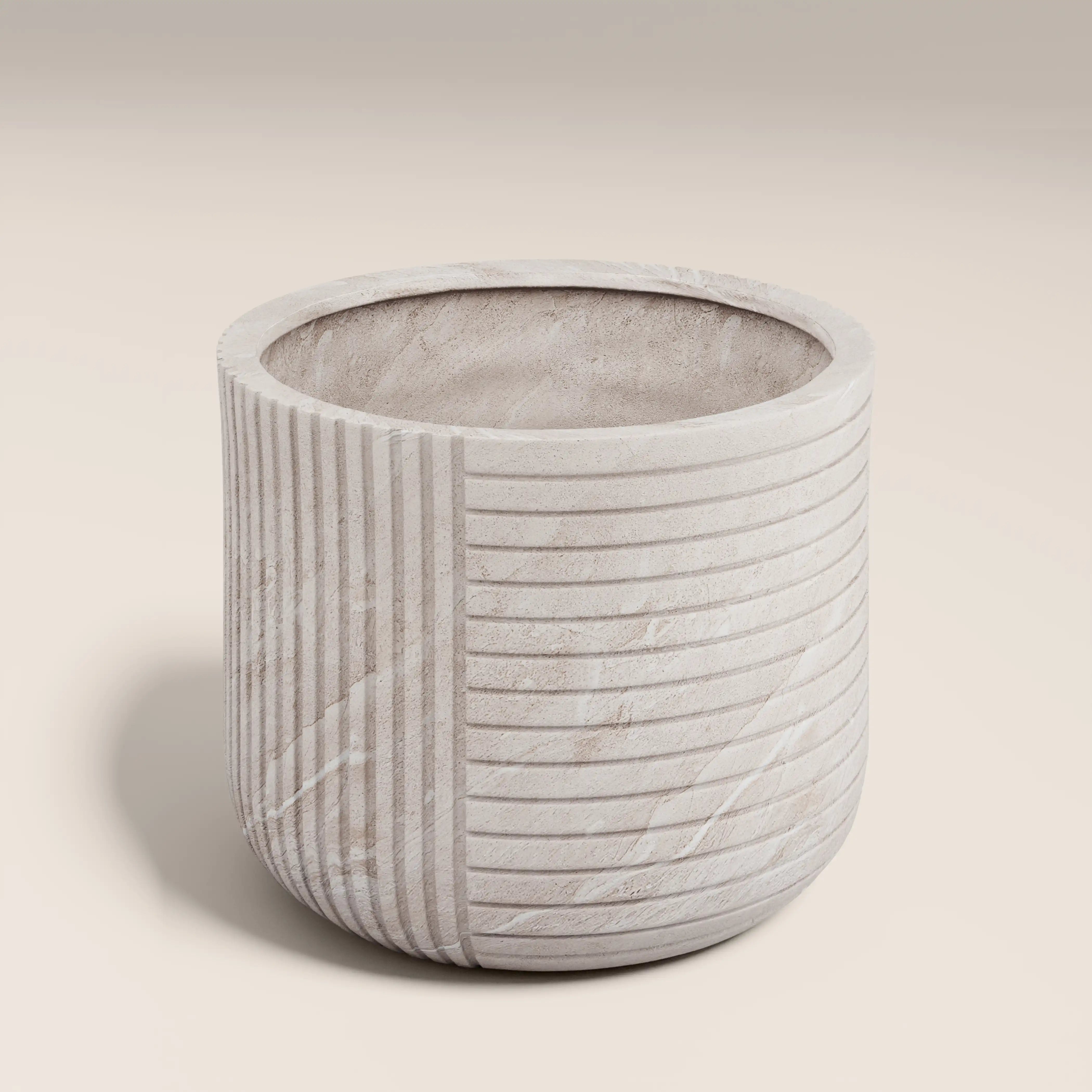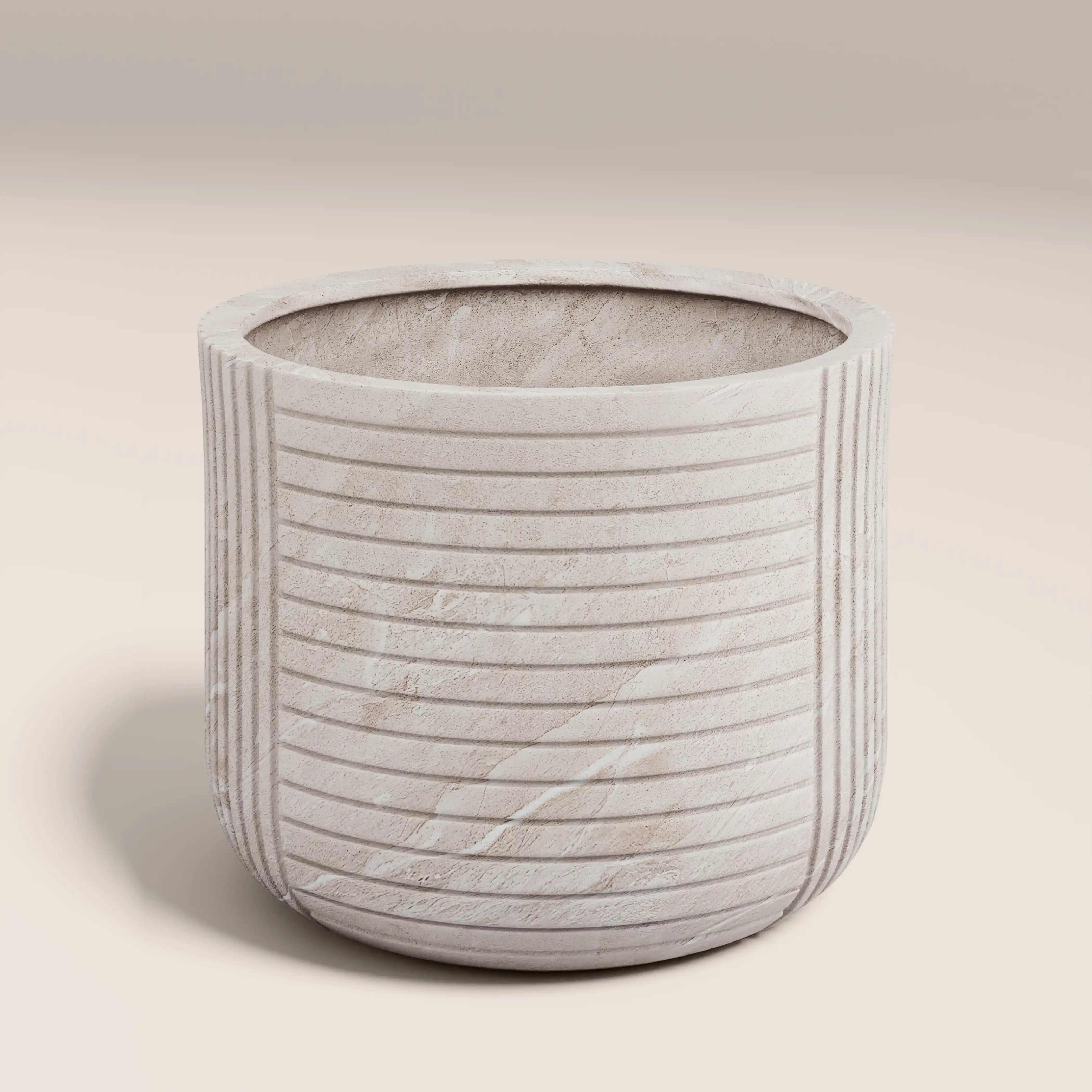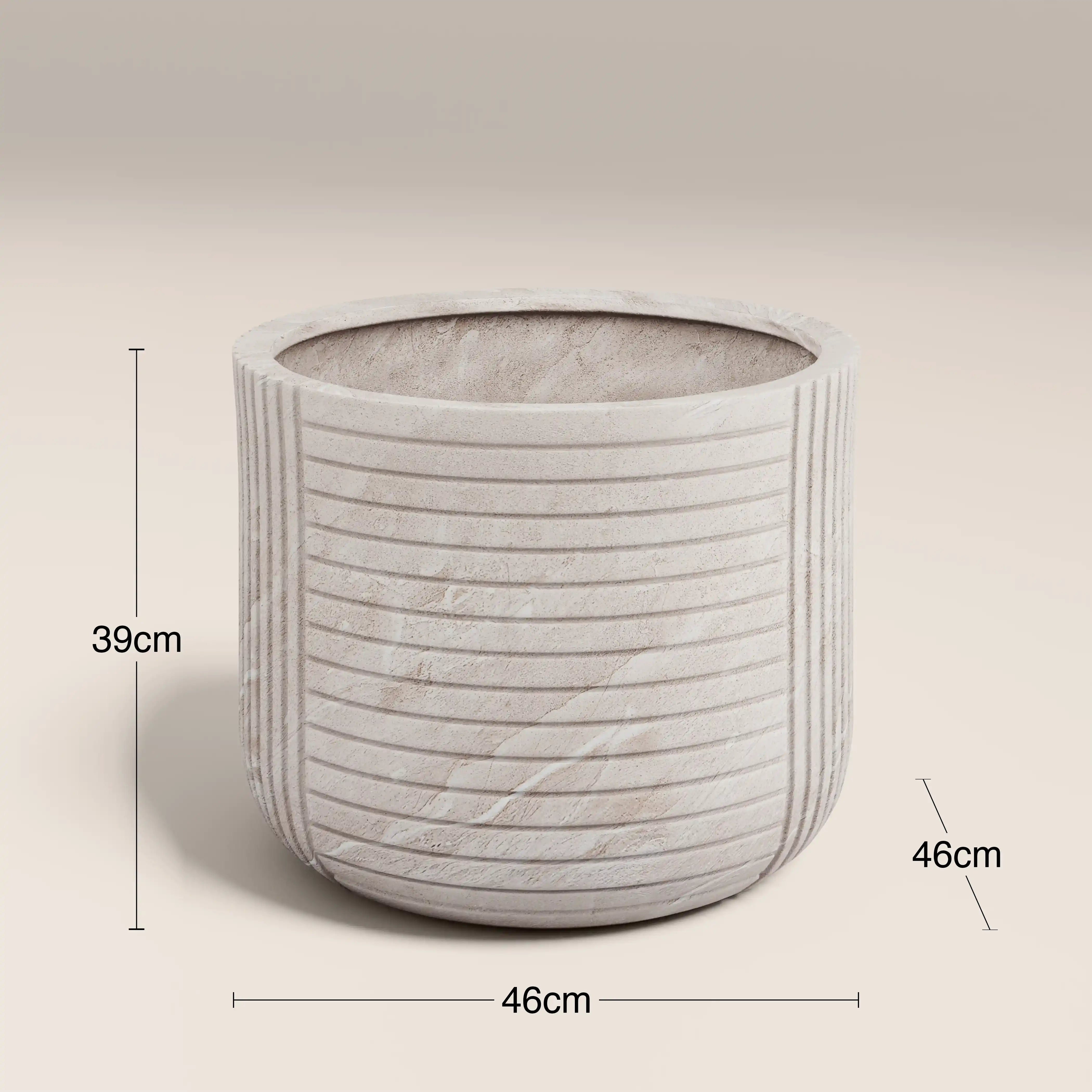 Whether you need a home for your large Monstera houseplant or flourishing garden fig tree, the Victor Big Planter is perfect for both indoor and outdoor spaces. This large, lightweight ficonstone design in a natural cream tone is frostproof and durable, with removable rubber base and drainage holes (so just add a tray when using indoors). Its ribbed, stone-like texture brings subtle depth to minimalist or neutral interiors, creating a Greek-esque pedestal effect for larger plants. Ideal for homes, patios and gardens.