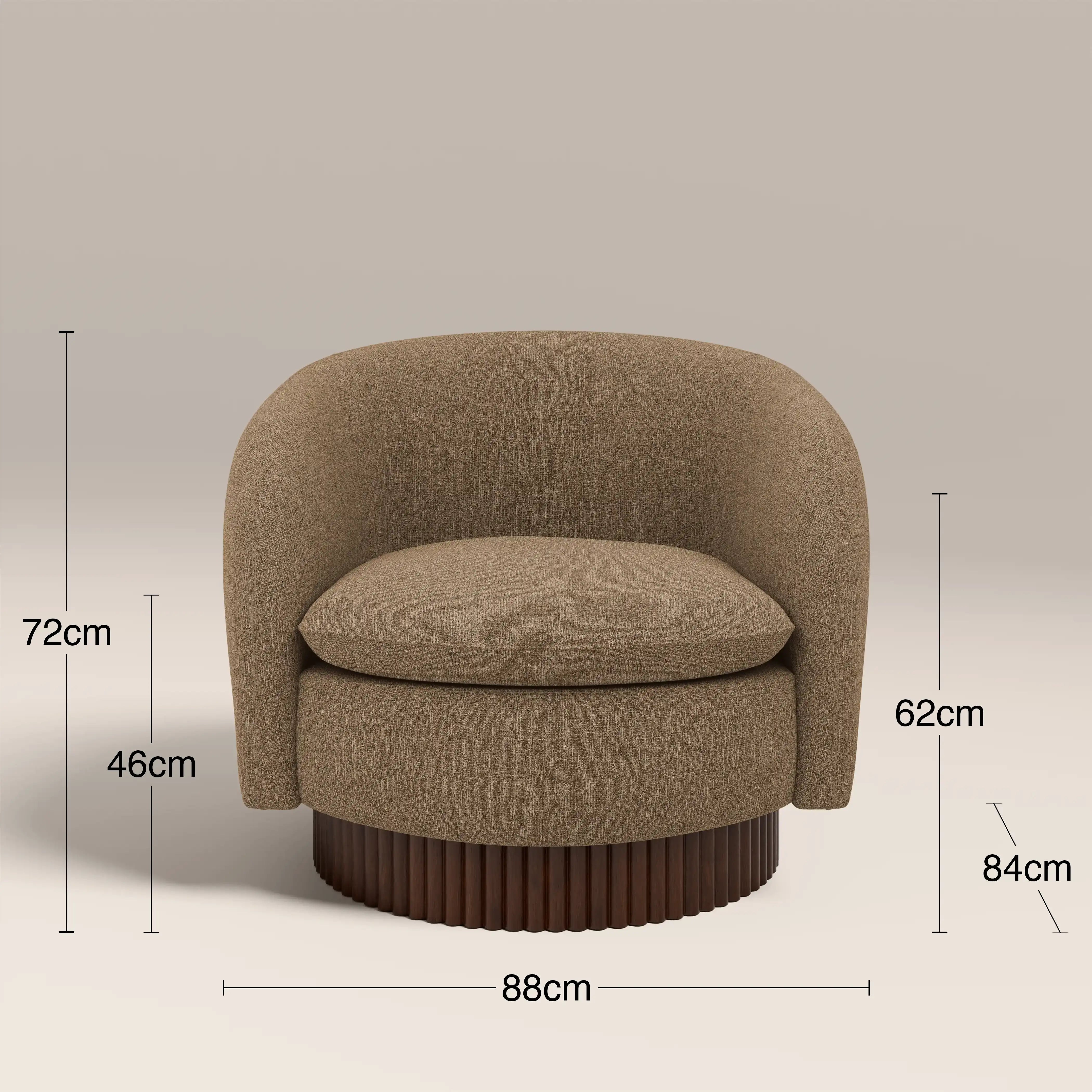 Introducing laid-back lounging with the Viva Swivel Chair in speckled cappuccino brown. This classic tub chair design has a low-slung, wide seat with a 360° swivel function for a truly elevated look, reminiscent of the relaxed 1960s interiors. The subtle details such as the ribbed walnut-stained wooden base and soft speckled boucle make for a statement accent armchair.