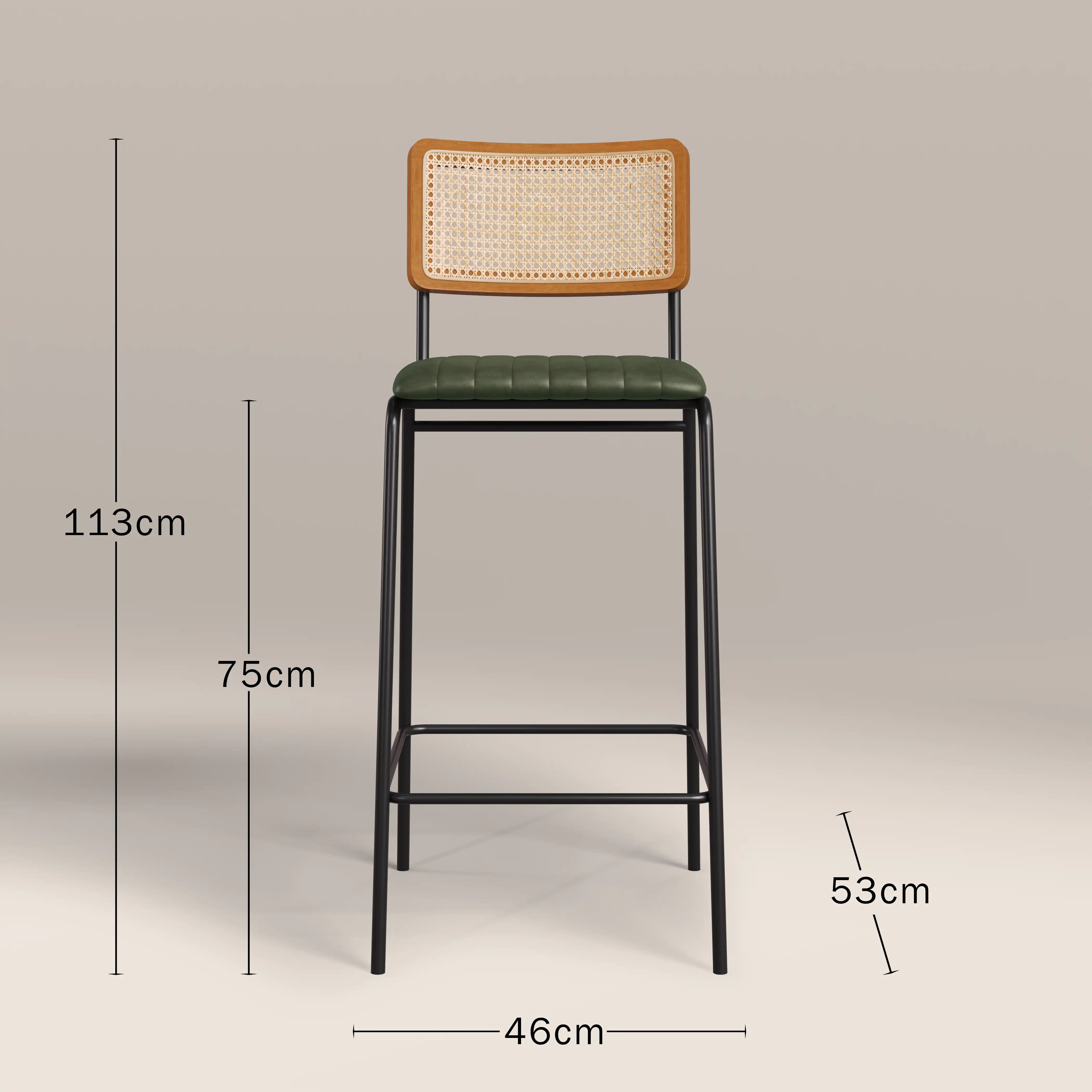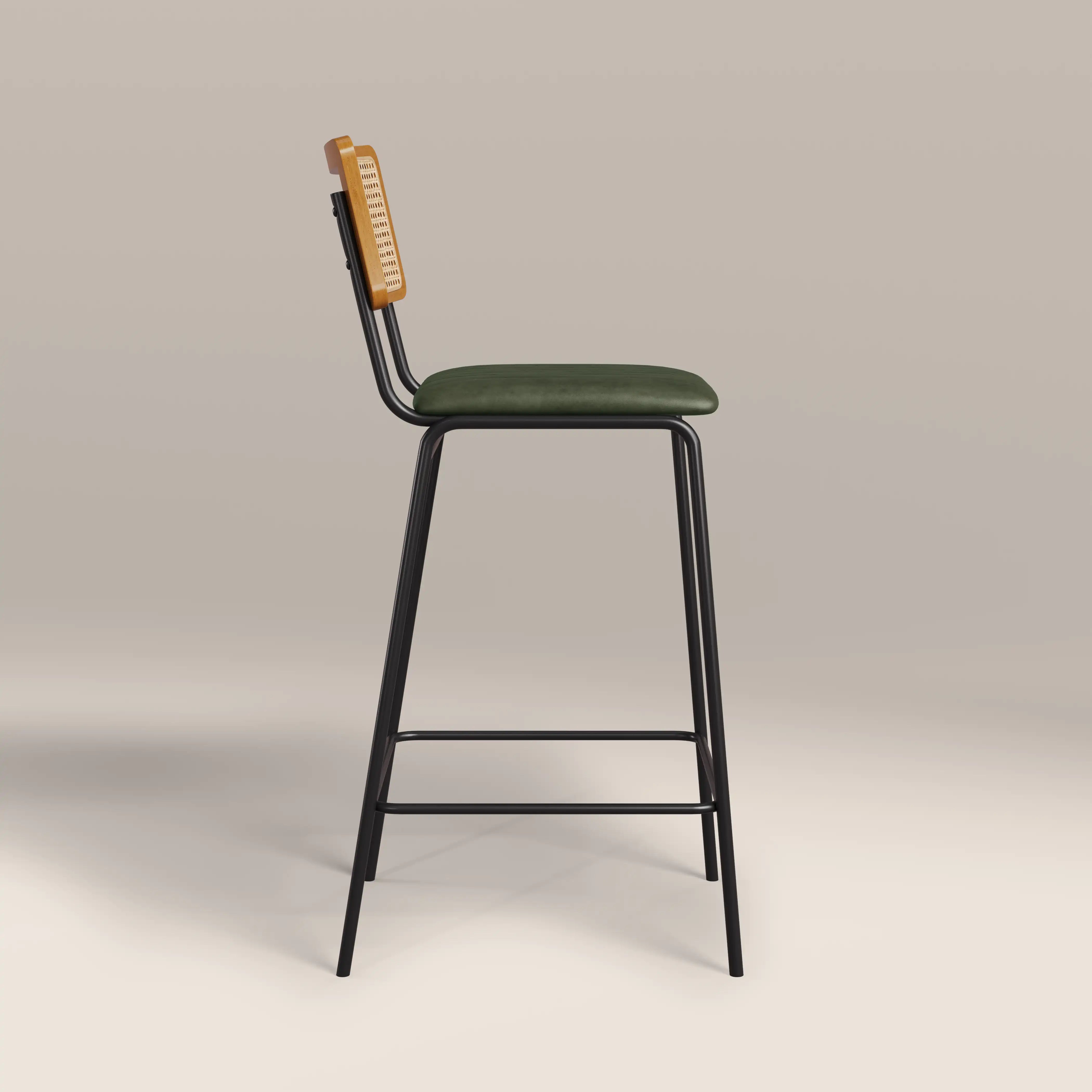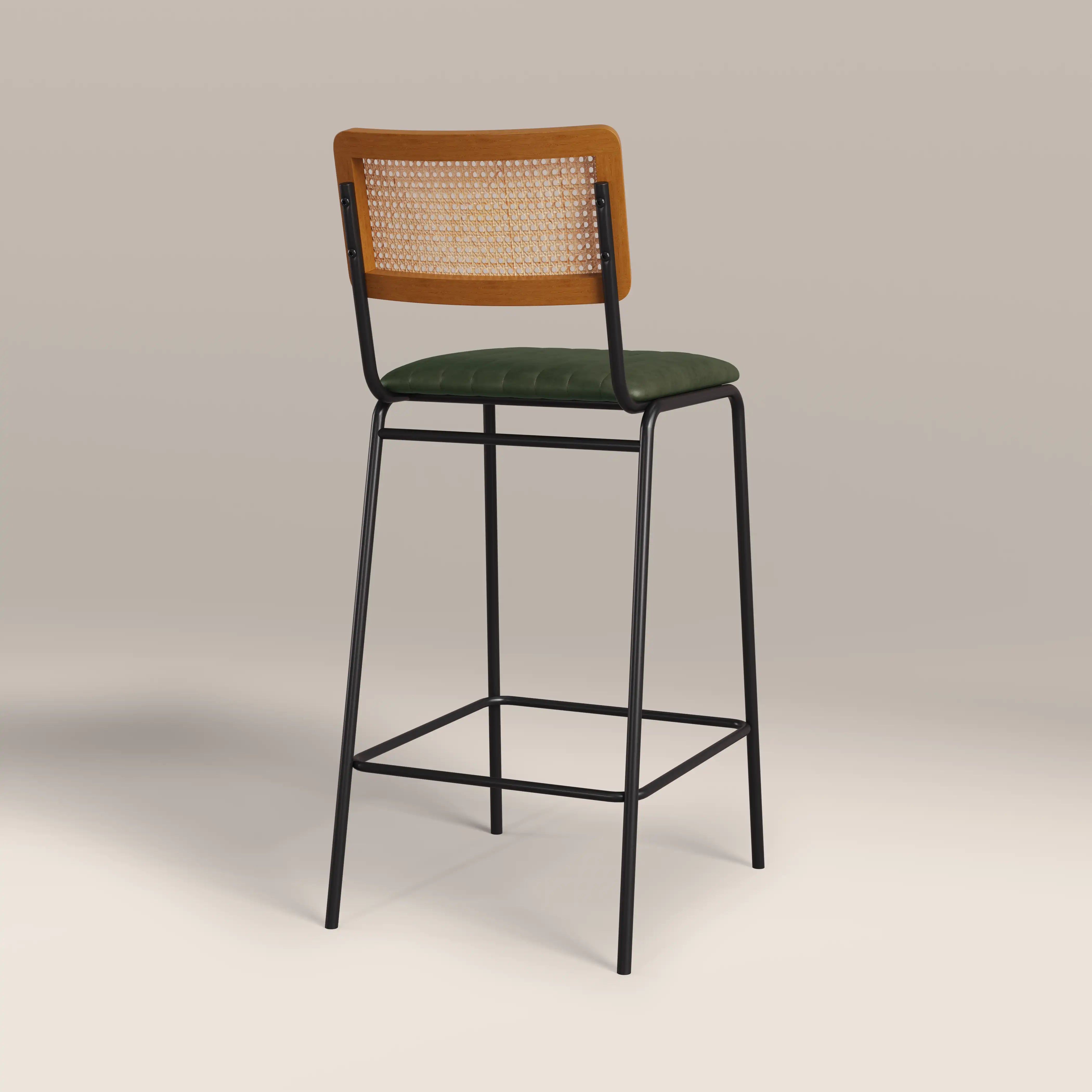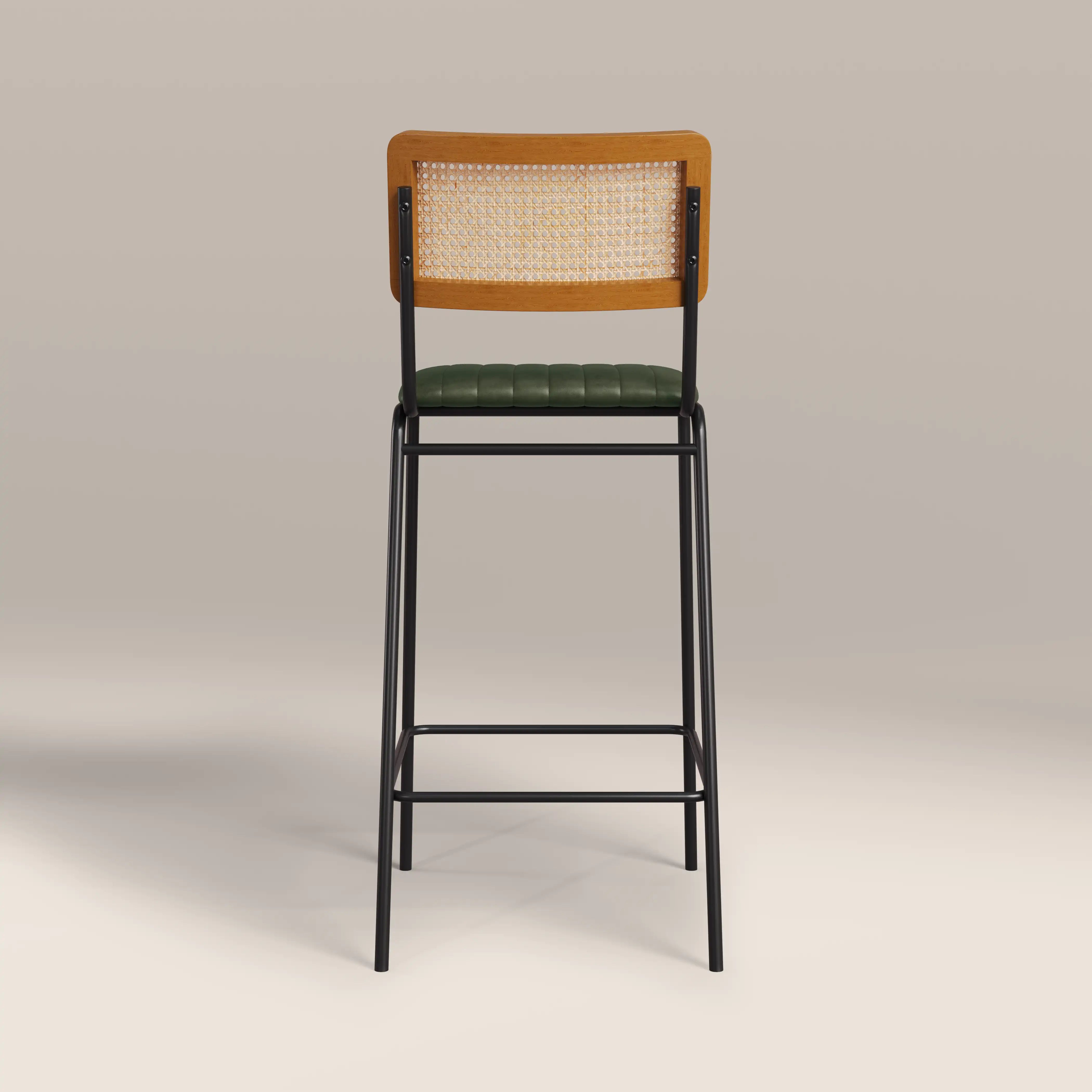 Calling all industrial and Nordic lovers! The Willis Bar Stool fuses these two styles perfectly. The seat is upholstered in a soft vintage green faux leather with stitched detailing sitting within a black frame for that industrial edge, whilst the clean silhouette and cane backrest bring all the Scandic design influence you need. The Willis Green Bar Stool offers a softer approach to both of these modern styles.