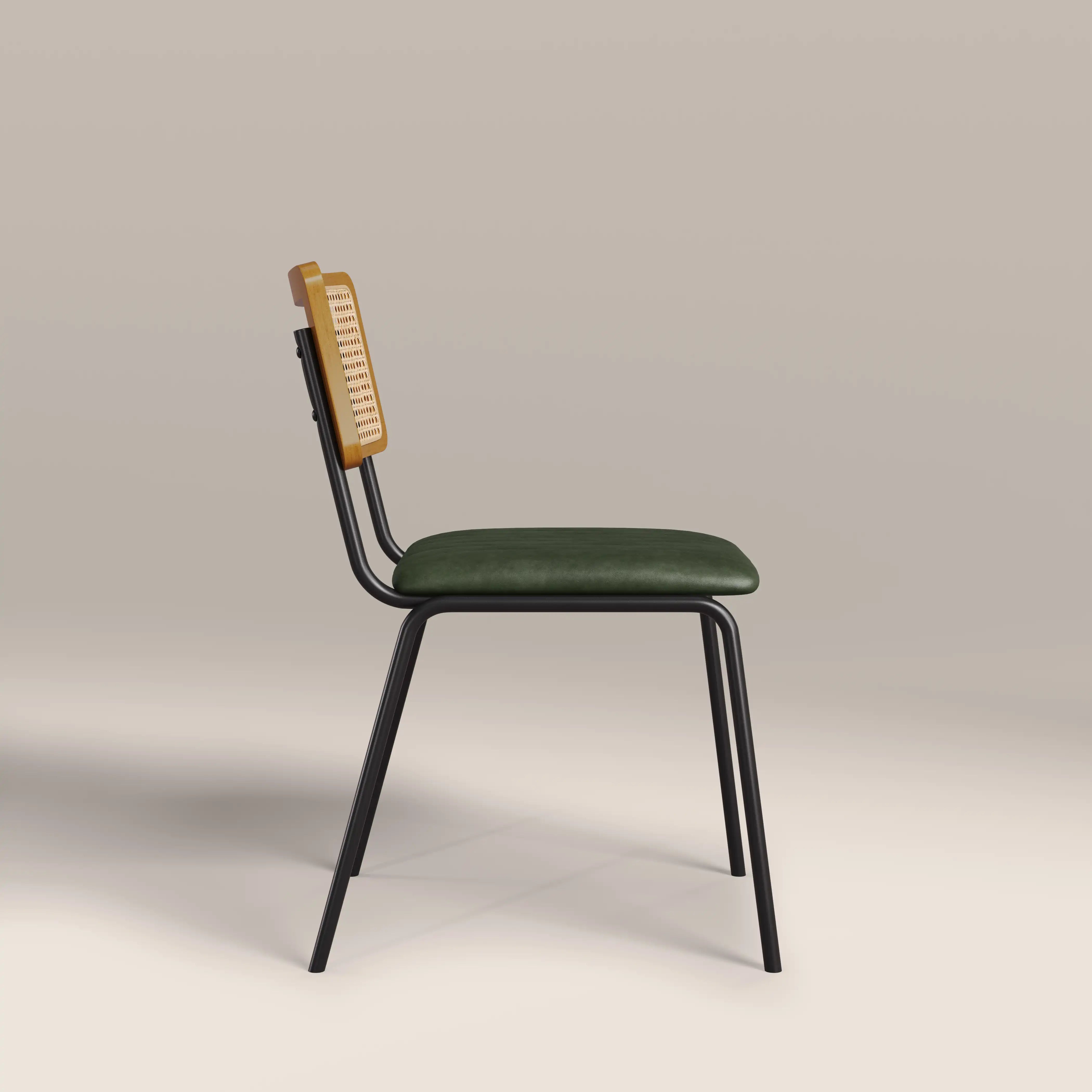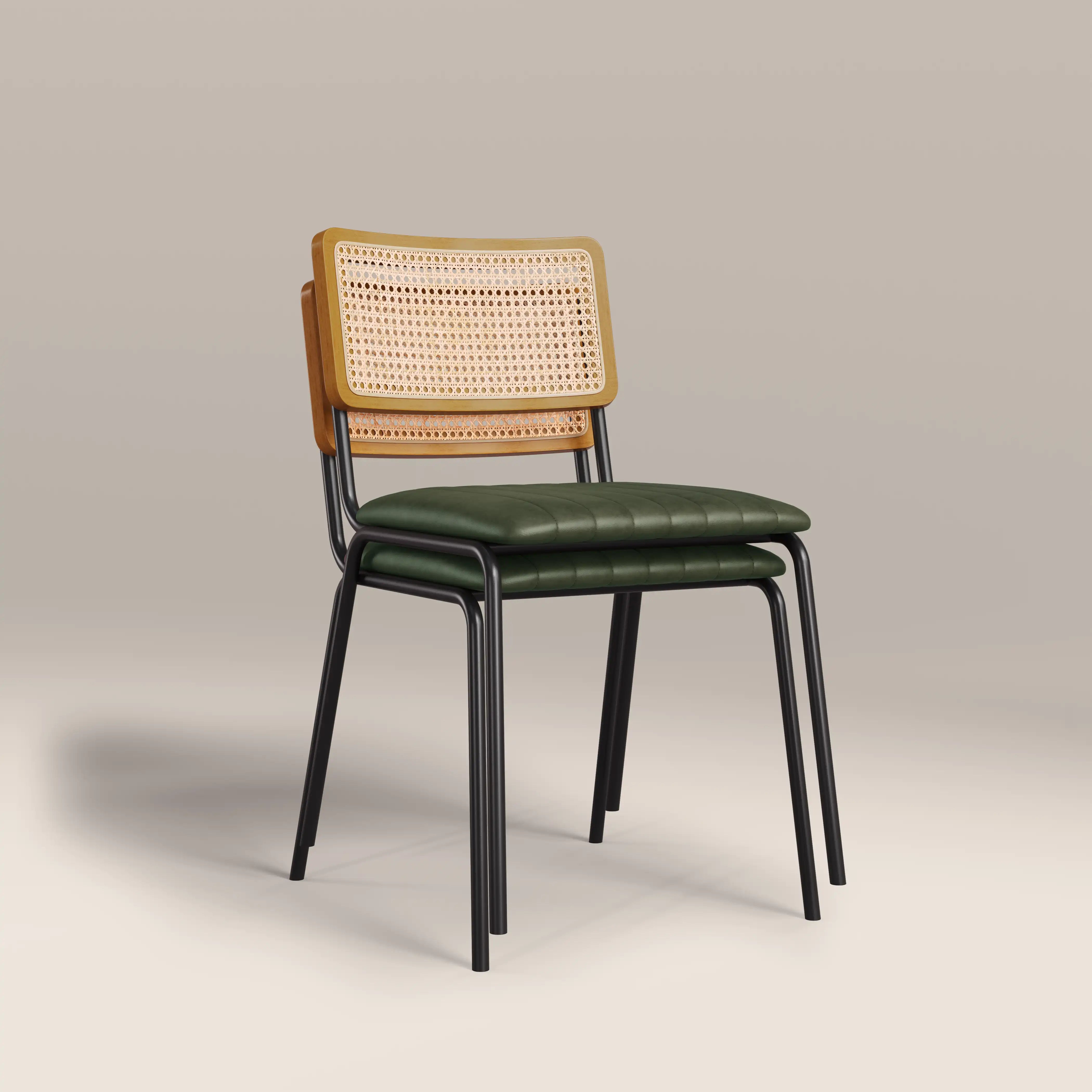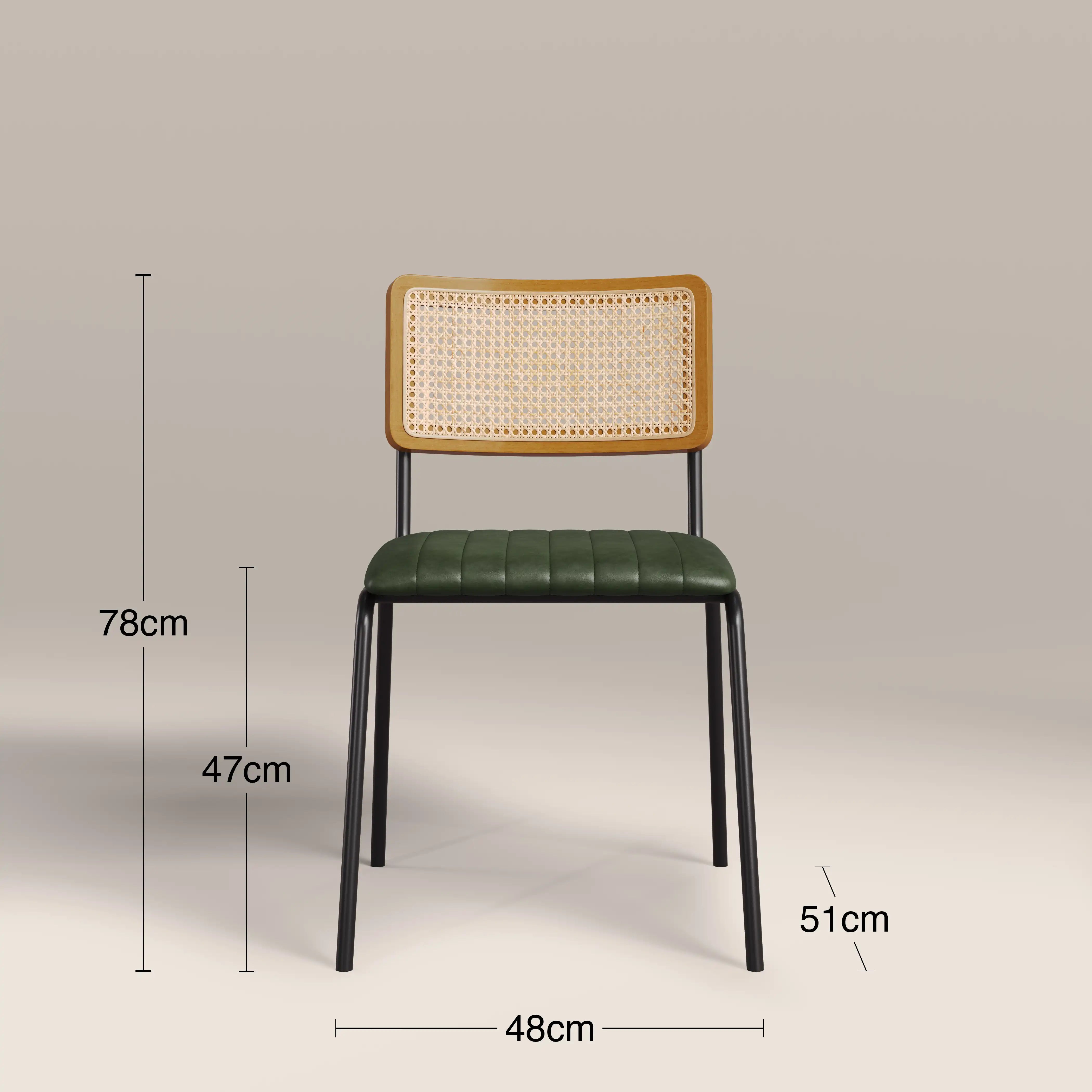 Calling all industrial and Nordic lovers! The Willis Stackable Dining Chair fuses these two styles perfectly. The seat is upholstered in a soft vintage green faux leather with stitched detailing sitting within a black frame for that industrial edge, whilst the clean silhouette and cane backrest bring all the Scandic design influence you need. The Willis Tan Dining Chair offers a softer approach to both of these modern styles.