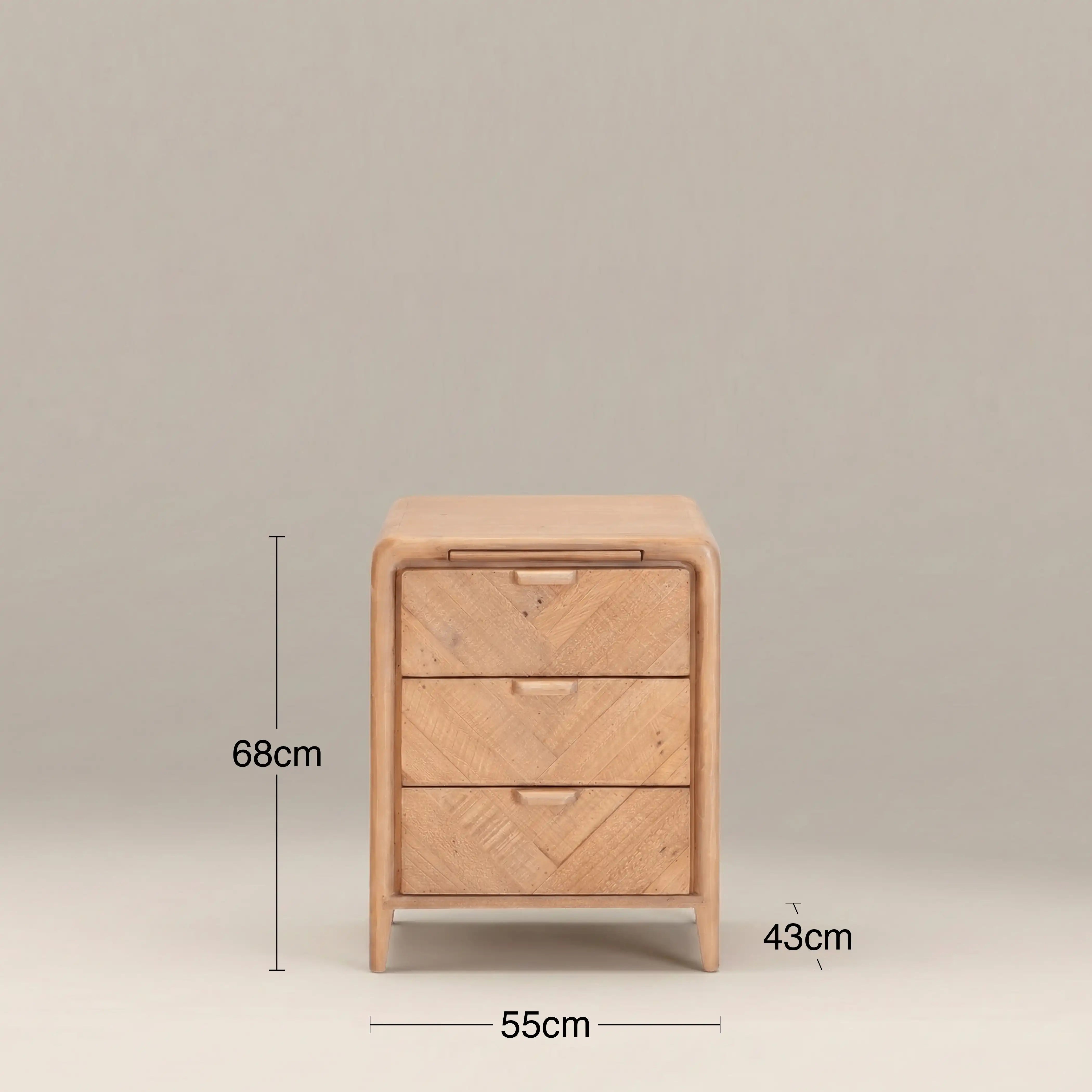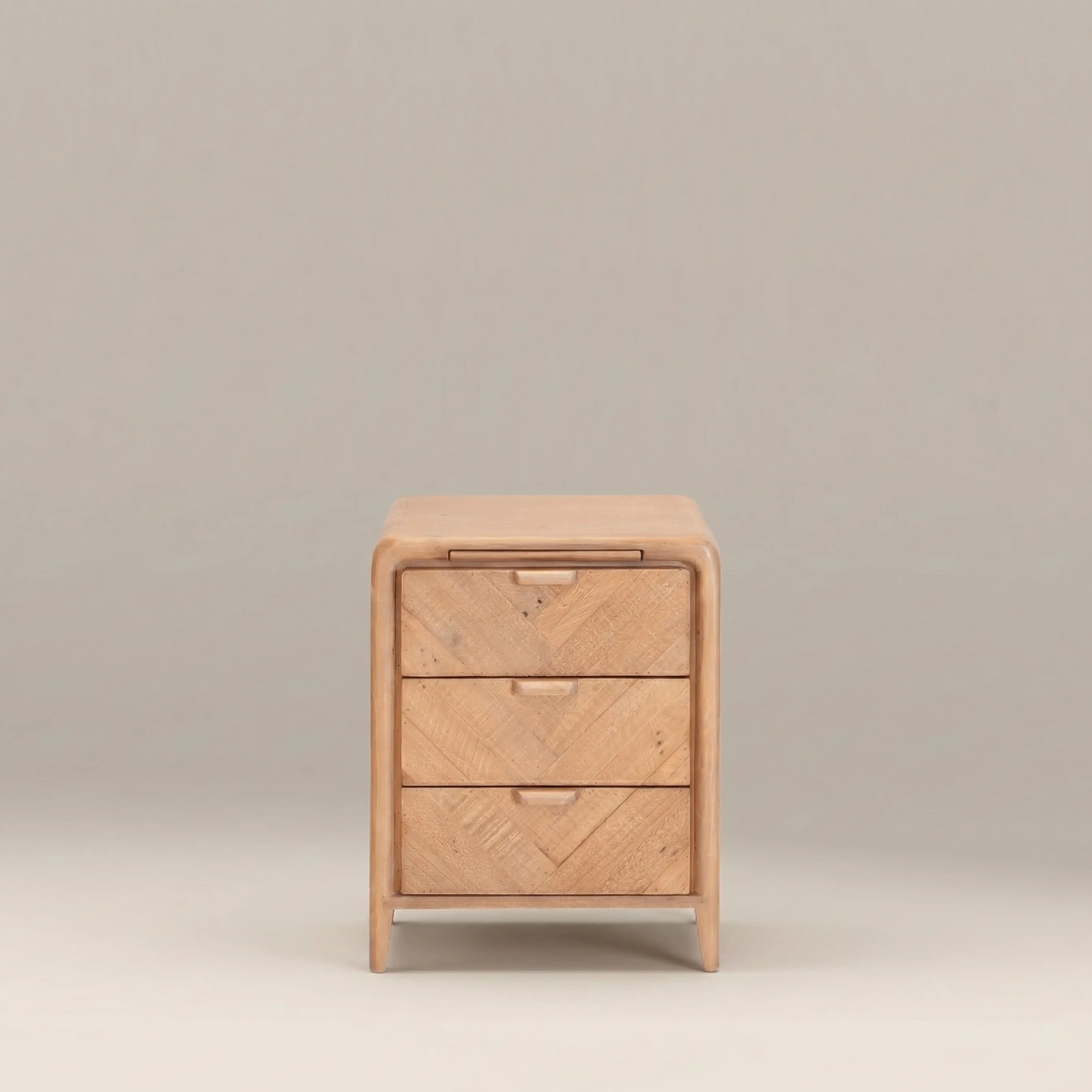 A beautifully crafted table designed in the UK, the Winslow Large Bedside Table has a herringbone design on each of the three drawers, with spacious storage within, ideal for all manner of bedroom knick-knacks. With durable timber wood and tapered legs, the Winslow is strong, sturdy and built to last- and constructed from FSC reclaimed timber wood for a more sustainable choice.